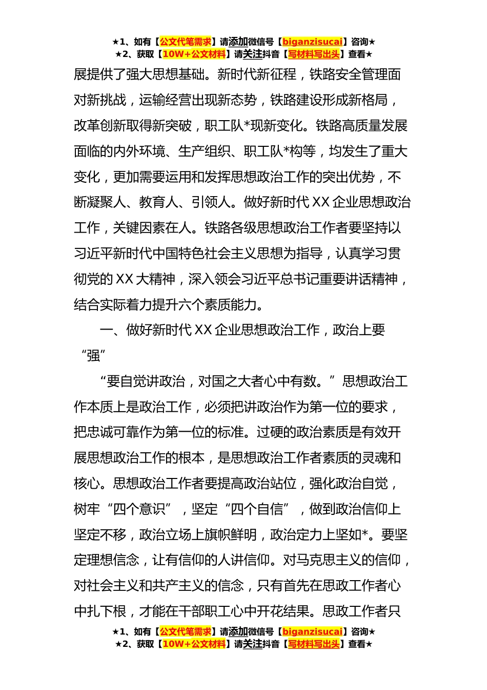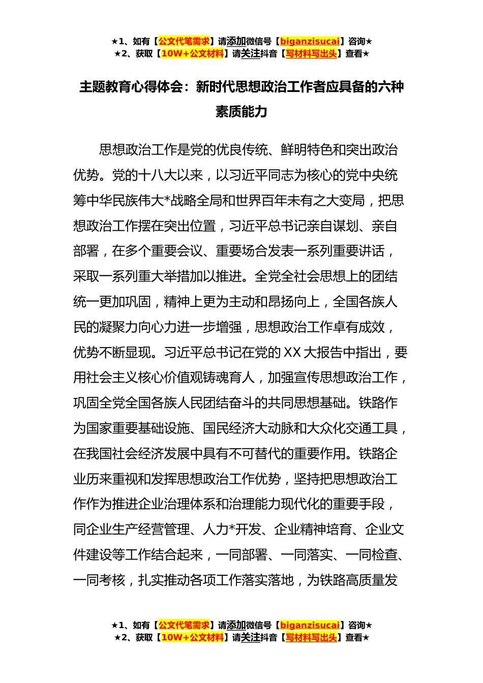 ★1、如有【公文代笔需求】请添加微信号【biganzisucai】咨询★★2、获取【10W+公文材料】请关注抖音【写材料写出头】查看★主题教育心得体会:新时代思想政治工作者应具备的六种素质能力思想政治工作是党的优良传统、鲜明特色和突出政治优势。党的十八大以来,以习近平同志为核心的党中央统筹中华民族伟大*战略全局和世界百年未有之大变局,把思想政治工作摆在突出位置,习近平总书记亲自谋划、亲自部署,在多个重要会议、重要场合发表一系列重要讲话,采取一系列重大举措加以推进。全党全社会思想上的团结统一更加巩固,精神上更为主动和昂扬向上,全国各族人民的凝聚力向心力进一步增强,思想政治工作卓有成效,优势不断显现。习近平总书记在党的XX大报告中指出,要用社会主义核心价值观铸魂育人,加强宣传思想...