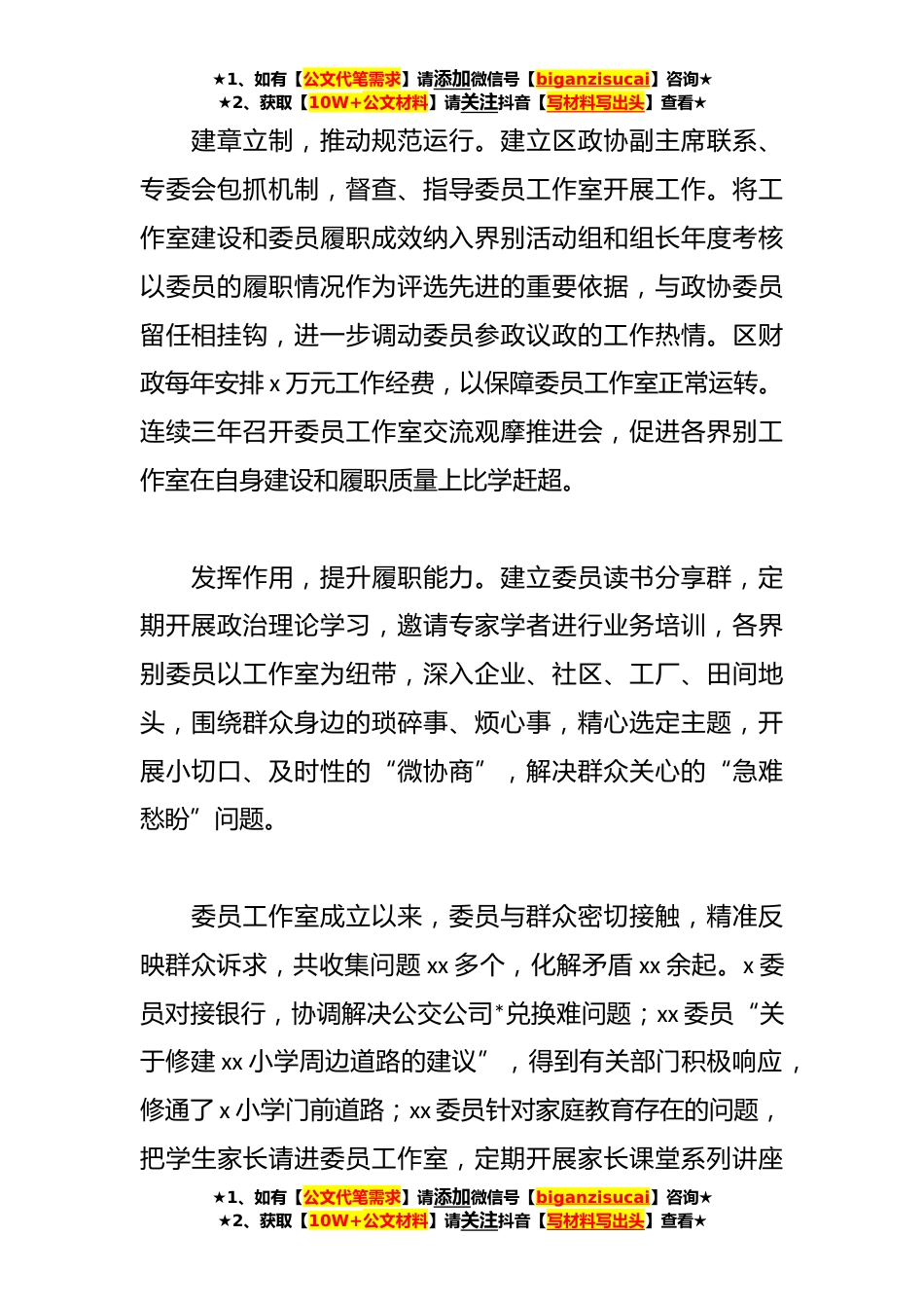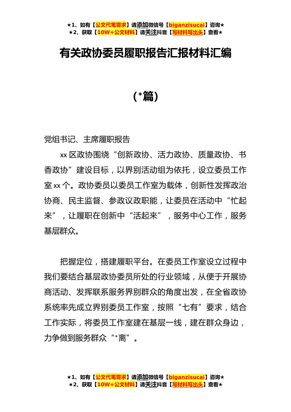 ★1、如有【公文代笔需求】请添加微信号【biganzisucai】咨询★★2、获取【10W+公文材料】请关注抖音【写材料写出头】查看★有关政协委员履职报告汇报材料汇编(*篇)党组书记、主席履职报告xx区政协围绕“创新政协、活力政协、质量政协、书香政协”建设目标,以界别活动组为依托,设立委员工作室xx个。政协委员以委员工作室为载体,创新性发挥政治协商、民主监督、参政议政职能,让委员在活动中“忙起来”,让履职在创新中“活起来”,服务中心工作,服务基层群众。把握定位,搭建履职平台。在委员工作室设立过程中我们要结合基层政协委员所处的行业领域,从便于开展协商活动、发挥联系服务界别群众的角度出发,在全省政协系统率先成立界别委员工作室,按照“七有”要求,结合工作实际,将委员工作室建在基层一线...