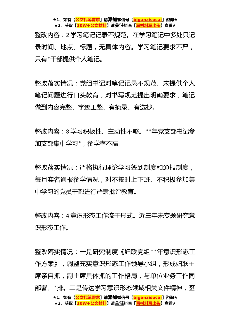 ★1、如有【公文代笔需求】请添加微信号【biganzisucai】咨询★★2、获取【10W+公文材料】请关注抖音【写材料写出头】查看★某区妇联党组关于巡察整改情况的报告根据党中央、区党委、市委和区委的安排部署,**年X月*至X月*对妇联党组开展常规巡察,并于**年X月*对巡察情况进行了反馈。按照党委公*则和巡察工作有关要求,现将巡察整改情况报告如下。一、聚焦党的理论路线方针政策、党中央和自治区党委重大决策、市委和区委部署要求在基层贯彻落实方面。整改内容:1理论学习不重视。未见党的XX大精神学习方案及中央第七次*工作座谈会精神学习心得体会。整改落实情况:一是科学合理制定学习计划,将学习习近平新时代中国特色社会主义思想、党的XX大精神、中央第七次*工作座谈会精神等纳入学习计划中,党组书记带头执...