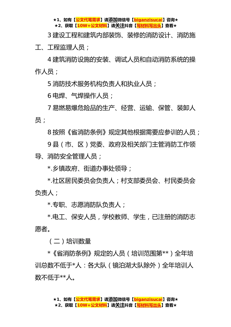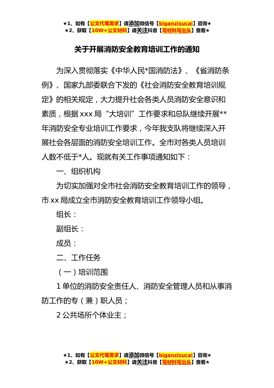 ★1、如有【公文代笔需求】请添加微信号【biganzisucai】咨询★★2、获取【10W+公文材料】请关注抖音【写材料写出头】查看★关于开展消防安全教育培训工作的通知为深入贯彻落实《中华人民*国消防法》、《省消防条例》、国家九部委联合下发的《社会消防安全教育培训规定》的相关规定,大力提升社会各类人员消防安全意识和素质,根据xxx局“大培训”工作要求和总队继续开展**年消防安全专业培训工作要求,今年我支队将继续深入开展社会各层面的消防安全培训工作。全市对各类人员培训人数不低于*人。现就有关工作事项通知如下:一、组织机构为切实加强对全市社会消防安全教育培训工作的领导,市xx局成立全市消防安全教育培训工作领导小组。组长:副组长:成员:二、工作任务(一)培训范围1单位的消防安全责任人、消...