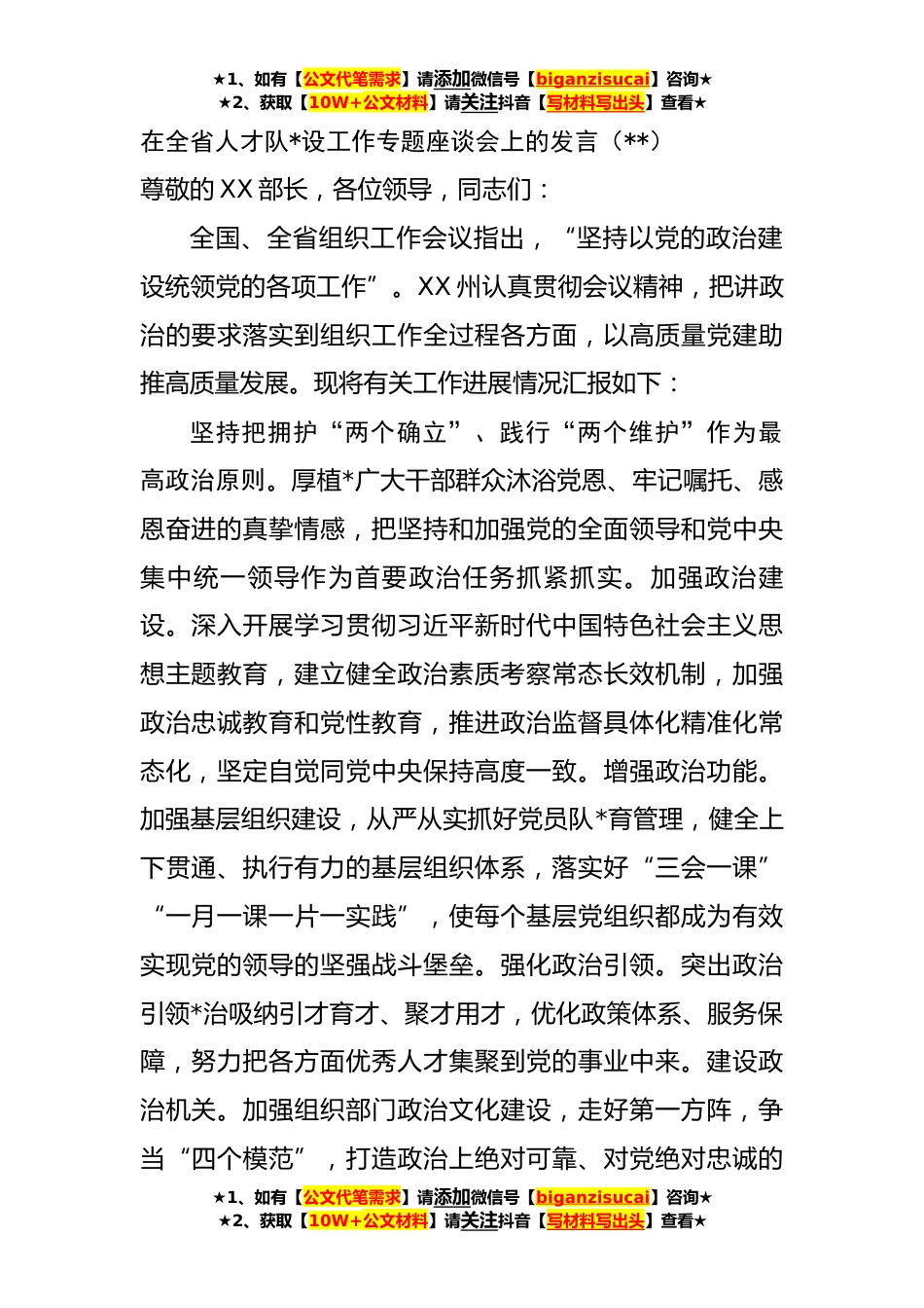 ★1、如有【公文代笔需求】请添加微信号【biganzisucai】咨询★★2、获取【10W+公文材料】请关注抖音【写材料写出头】查看★在全省人才队*设工作专题座谈会上的发言(**)尊敬的XX部长,各位领导,同志们:全国、全省组织工作会议指出,“坚持以党的政治建设统领党的各项工作”。XX州认真贯彻会议精神,把讲政治的要求落实到组织工作全过程各方面,以高质量党建助推高质量发展。现将有关工作进展情况汇报如下:坚持把拥护“两个确立”、践行“两个维护”作为最高政治原则。厚植*广大干部群众沐浴党恩、牢记嘱托、感恩奋进的真挚情感,把坚持和加强党的全面领导和党中央集中统一领导作为首要政治任务抓紧抓实。加强政治建设。深入开展学习贯彻习近平新时代中国特色社会主义思想主题教育,建立健全政治素质考察常态...