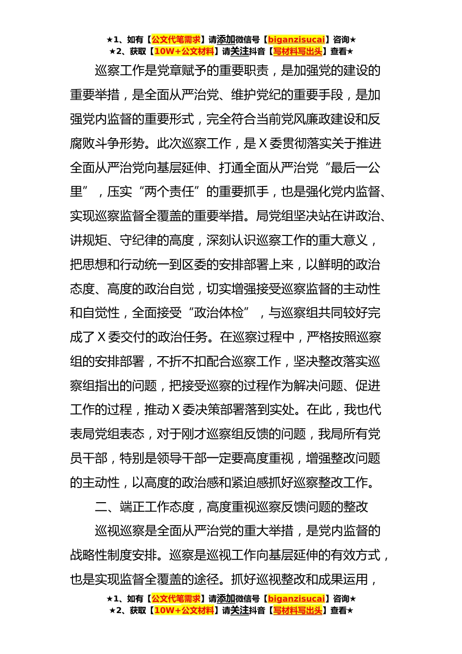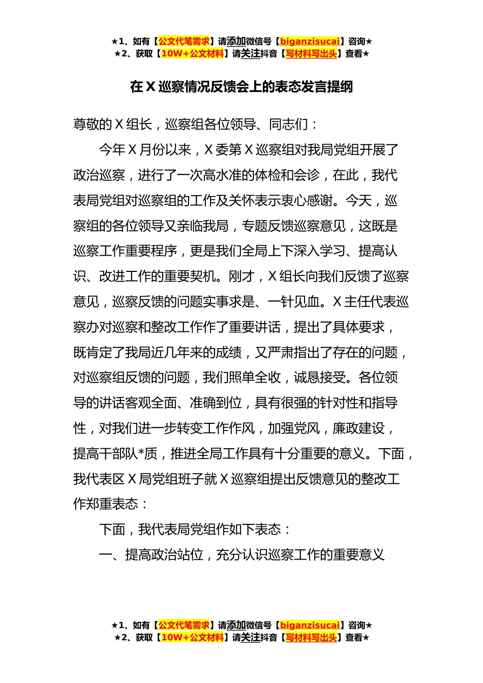 ★1、如有【公文代笔需求】请添加微信号【biganzisucai】咨询★★2、获取【10W+公文材料】请关注抖音【写材料写出头】查看★在X巡察情况反馈会上的表态发言提纲尊敬的X组长,巡察组各位领导、同志们:今年X月份以来,X委第X巡察组对我局党组开展了政治巡察,进行了一次高水准的体检和会诊,在此,我代表局党组对巡察组的工作及关怀表示衷心感谢。今天,巡察组的各位领导又亲临我局,专题反馈巡察意见,这既是巡察工作重要程序,更是我们全局上下深入学习、提高认识、改进工作的重要契机。刚才,X组长向我们反馈了巡察意见,巡察反馈的问题实事求是、一针见血。X主任代表巡察办对巡察和整改工作作了重要讲话,提出了具体要求,既肯定了我局近几年来的成绩,又严肃指出了存在的问题,对巡察组反馈的问题,我们照单全...