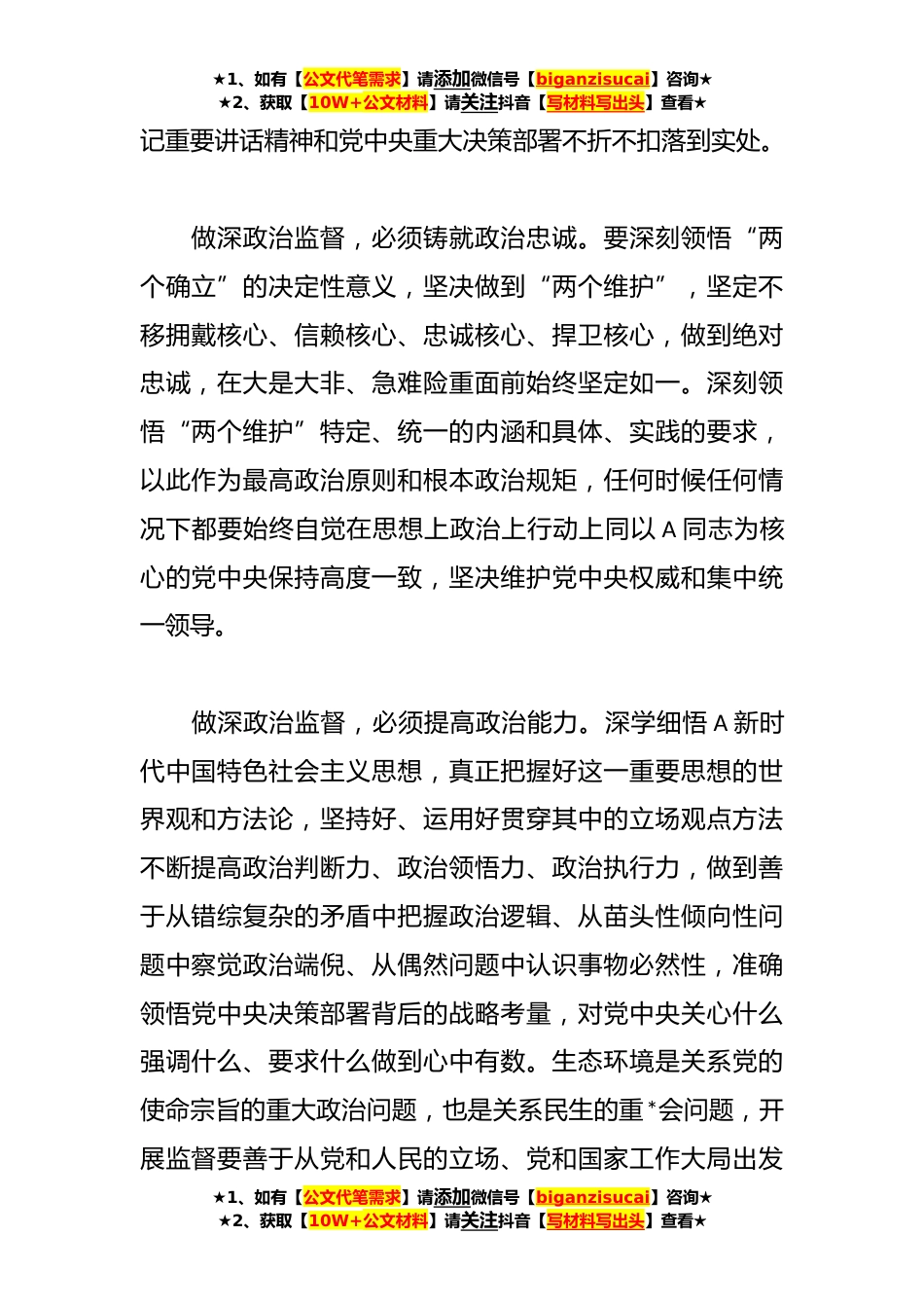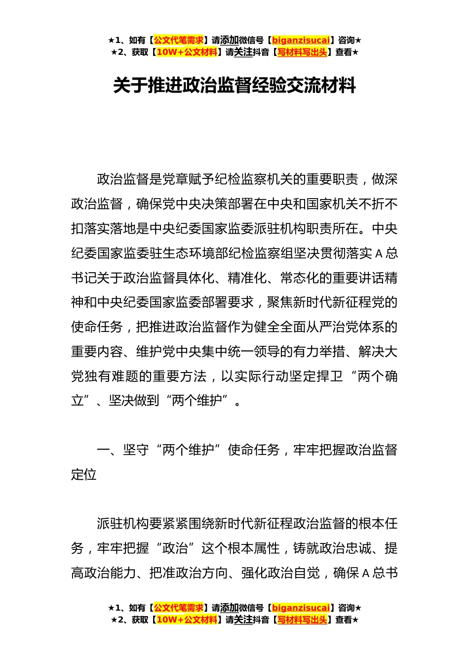 ★1、如有【公文代笔需求】请添加微信号【biganzisucai】咨询★★2、获取【10W+公文材料】请关注抖音【写材料写出头】查看★关于推进政治监督经验交流材料政治监督是党章赋予纪检监察机关的重要职责,做深政治监督,确保党中央决策部署在中央和国家机关不折不扣落实落地是中央纪委国家监委派驻机构职责所在。中央纪委国家监委驻生态环境部纪检监察组坚决贯彻落实A总书记关于政治监督具体化、精准化、常态化的重要讲话精神和中央纪委国家监委部署要求,聚焦新时代新征程党的使命任务,把推进政治监督作为健全全面从严治党体系的重要内容、维护党中央集中统一领导的有力举措、解决大党独有难题的重要方法,以实际行动坚定捍卫“两个确立”、坚决做到“两个维护”。一、坚守“两个维护”使命任务,牢牢把握政治监督定...