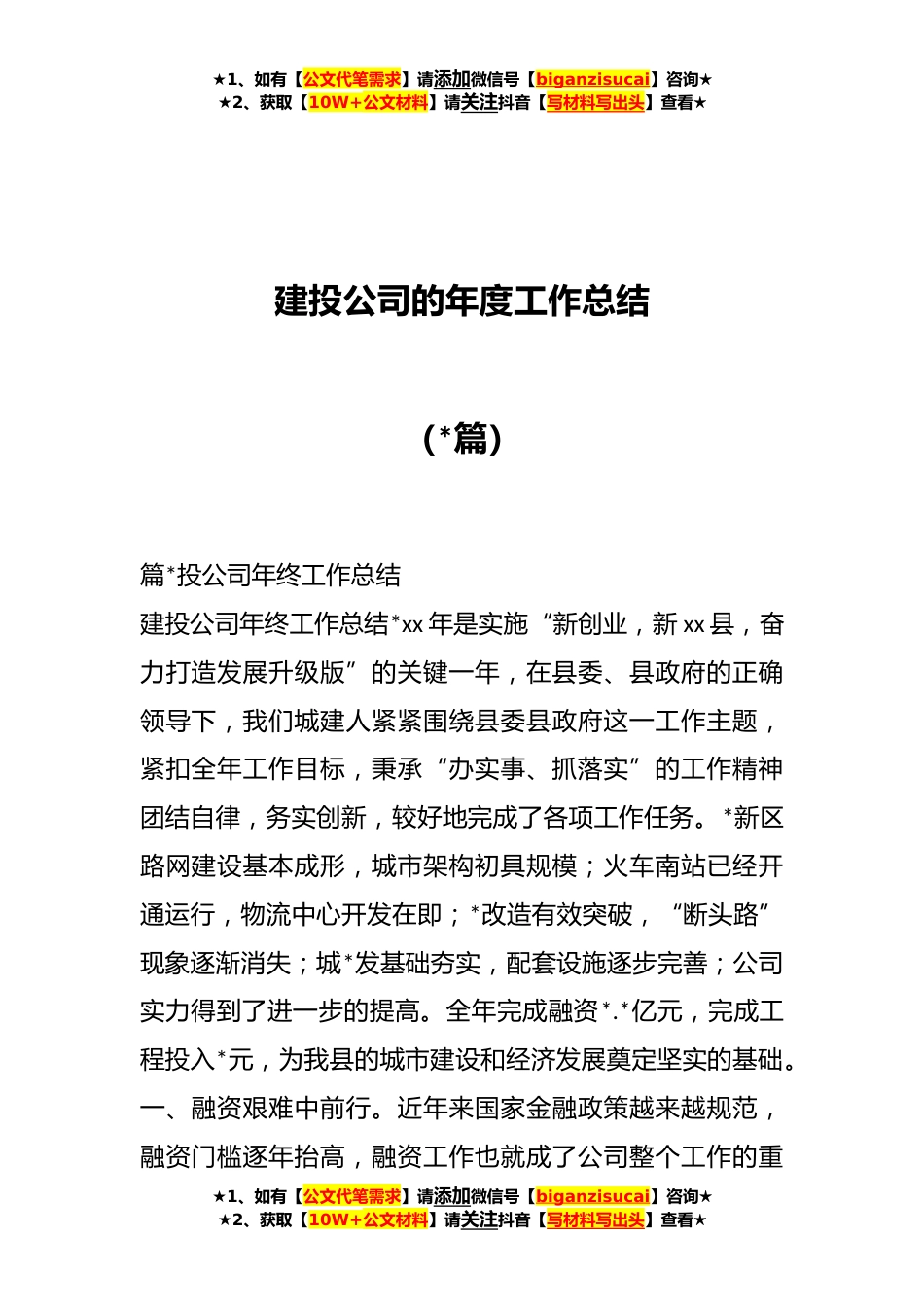 ★1、如有【公文代笔需求】请添加微信号【biganzisucai】咨询★★2、获取【10W+公文材料】请关注抖音【写材料写出头】查看★建投公司的年度工作总结(*篇)篇*投公司年终工作总结建投公司年终工作总结*xx年是实施“新创业,新xx县,奋力打造发展升级版”的关键一年,在县委、县政府的正确领导下,我们城建人紧紧围绕县委县政府这一工作主题,紧扣全年工作目标,秉承“办实事、抓落实”的工作精神团结自律,务实创新,较好地完成了各项工作任务。*新区路网建设基本成形,城市架构初具规模;火车南站已经开通运行,物流中心开发在即;*改造有效突破,“断头路”现象逐渐消失;城*发基础夯实,配套设施逐步完善;公司实力得到了进一步的提高。全年完成融资*.*亿元,完成工程投入*元,为我县的城市建设和经济发展奠定...