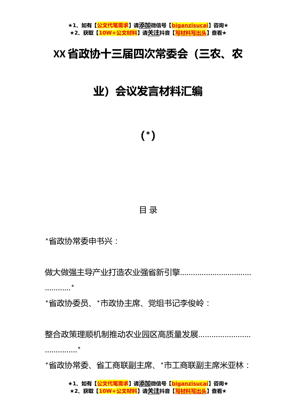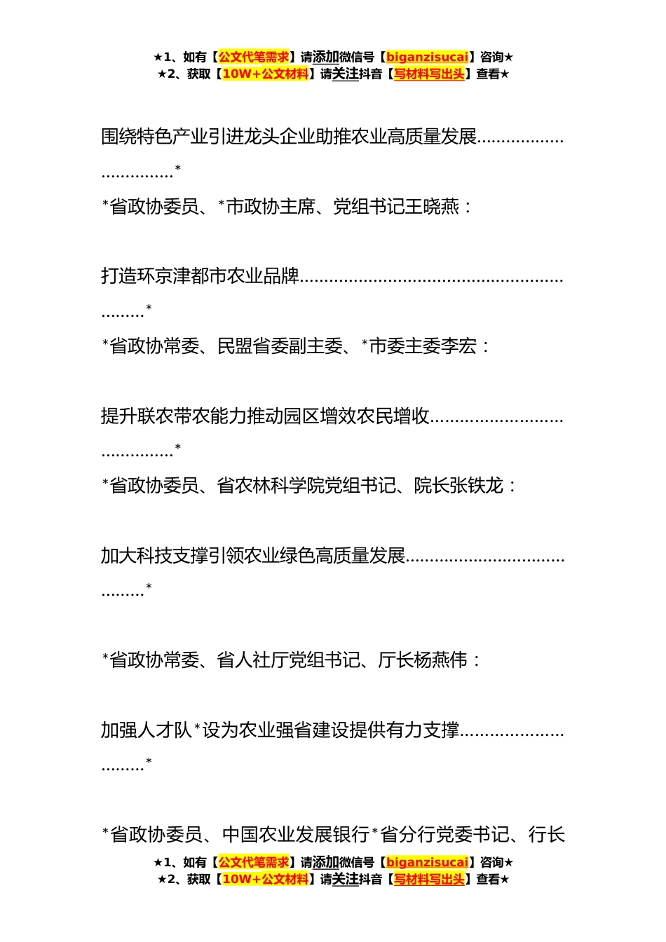 ★1、如有【公文代笔需求】请添加微信号【biganzisucai】咨询★★2、获取【10W+公文材料】请关注抖音【写材料写出头】查看★XX省政协十三届四次常委会(三农、农业)会议发言材料汇编(*)目录*省政协常委申书兴:做大做强主导产业打造农业强省新引擎………………………………………**省政协委员、*市政协主席、党组书记李俊岭:整合政策理顺机制推动农业园区高质量发展…………………………………**省政协常委、省工商联副主席、*市工商联副主席米亚林:★1、如有【公文代笔需求】请添加微信号【biganzisucai】咨询★★2、获取【10W+公文材料】请关注抖音【写材料写出头】查看★★1、如有【公文代笔需求】请添加微信号【biganzisucai】咨询★★2、获取【10W+公文材料】请关注抖音【写材料写出头】查看★围绕特色...