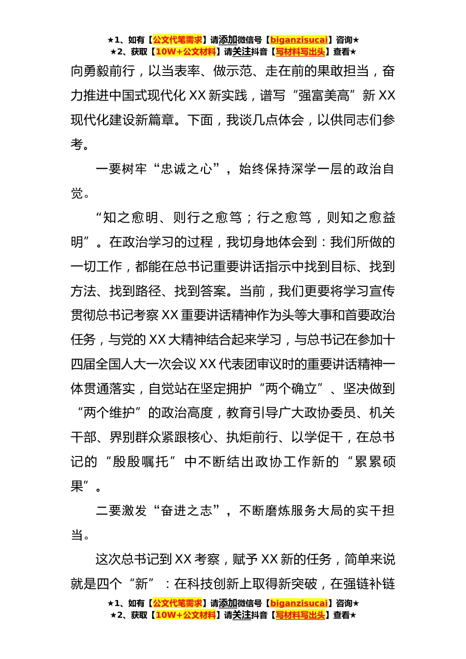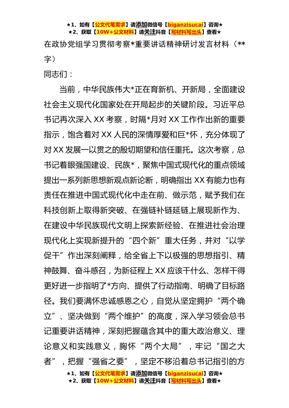 ★1、如有【公文代笔需求】请添加微信号【biganzisucai】咨询★★2、获取【10W+公文材料】请关注抖音【写材料写出头】查看★在政协党组学习贯彻考察*重要讲话精神研讨发言材料(**字)同志们:当前,中华民族伟大*正在育新机、开新局,全面建设社会主义现代化国家处在开局起步的关键阶段。习近平总书记再次深入XX考察,时隔*月对XX工作作出新的重要指示,饱含着对XX人民的深情厚爱和巨*怀,充分体现了对XX发展一以贯之的殷切期望和信任重托。这次考察,总书记着眼强国建设、民族*,聚焦中国式现代化的重点领域提出一系列新思想新观点新论断,明确指出XX有能力也有责任在推进中国式现代化中走在前、做示范,赋予我们在科技创新上取得新突破、在强链补链延链上展现新作为、在建设中华民族现代文明上探索新经验、在推...