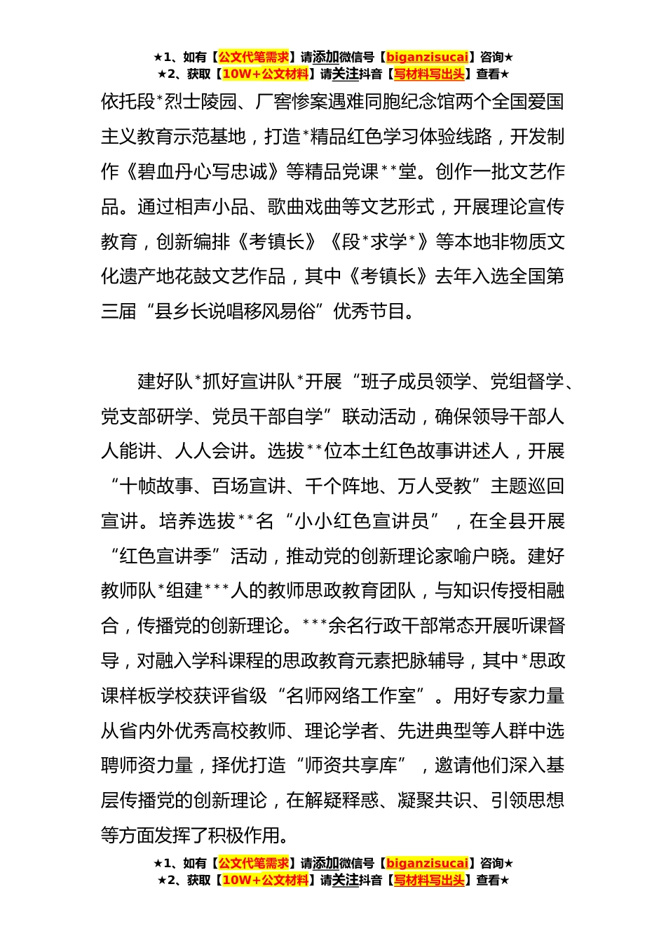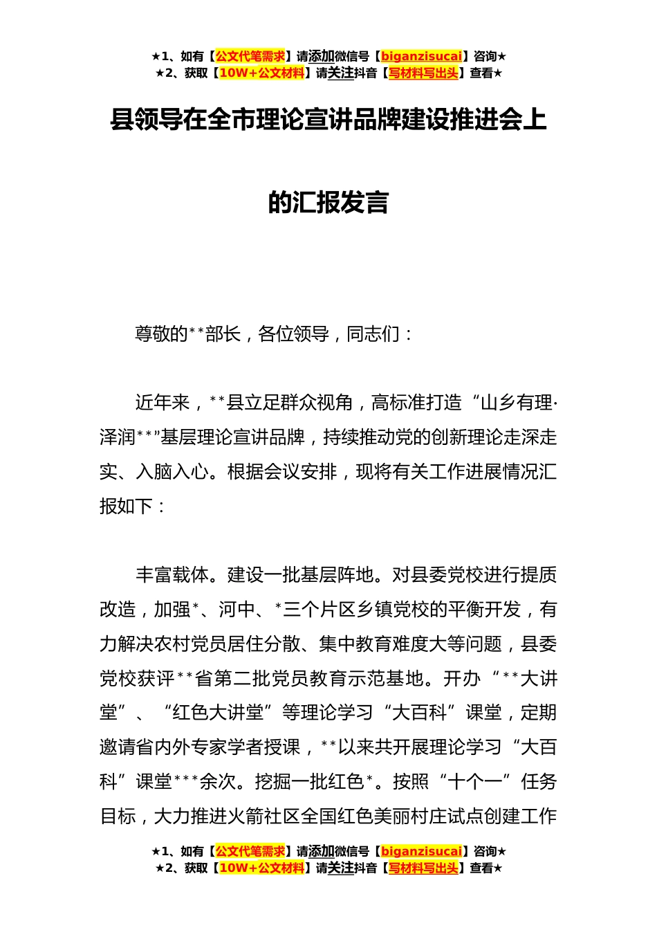 ★1、如有【公文代笔需求】请添加微信号【biganzisucai】咨询★★2、获取【10W+公文材料】请关注抖音【写材料写出头】查看★县领导在全市理论宣讲品牌建设推进会上的汇报发言尊敬的**部长,各位领导,同志们:近年来,**县立足群众视角,高标准打造“山乡有理·泽润**”基层理论宣讲品牌,持续推动党的创新理论走深走实、入脑入心。根据会议安排,现将有关工作进展情况汇报如下:丰富载体。建设一批基层阵地。对县委党校进行提质改造,加强*、河中、*三个片区乡镇党校的平衡开发,有力解决农村党员居住分散、集中教育难度大等问题,县委党校获评**省第二批党员教育示范基地。开办“**大讲堂”、“红色大讲堂”等理论学习“大百科”课堂,定期邀请省内外专家学者授课,**以来共开展理论学习“大百科”课堂***余次。...