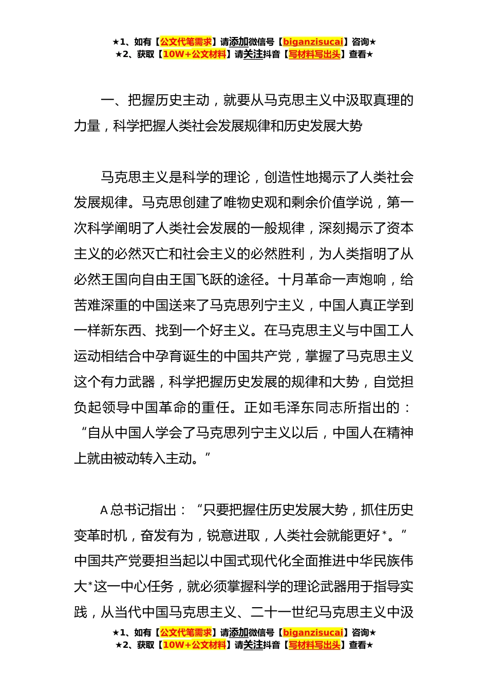★1、如有【公文代笔需求】请添加微信号【biganzisucai】咨询★★2、获取【10W+公文材料】请关注抖音【写材料写出头】查看★主题党课:把握历史主动勇于担当作为奋力推进中华民族伟大*同志们:中国共产党依靠马克思主义的科学指导洞察历史大势担当历史使命,开创美好未来。A总书记指出:“拥有马克思主义科学理论指导是我们党坚定信仰信念、把握历史主动的根本所在。”在新时代,中国共产党要完成团结带领全国各族人民全面建成社会主义现代化强国、全面推进中华民族伟大*的历史任务,就要不断从马克思主义中汲取坚定历史自信、增强历史主动的奋进力量。A新时代中国特色社会主义思想是当代中国马克思主义、二十一世纪马克思主义。当前,第二批主题教育正在深入开展,应以此为契机,推动全党更加深入地学习贯彻A新时...