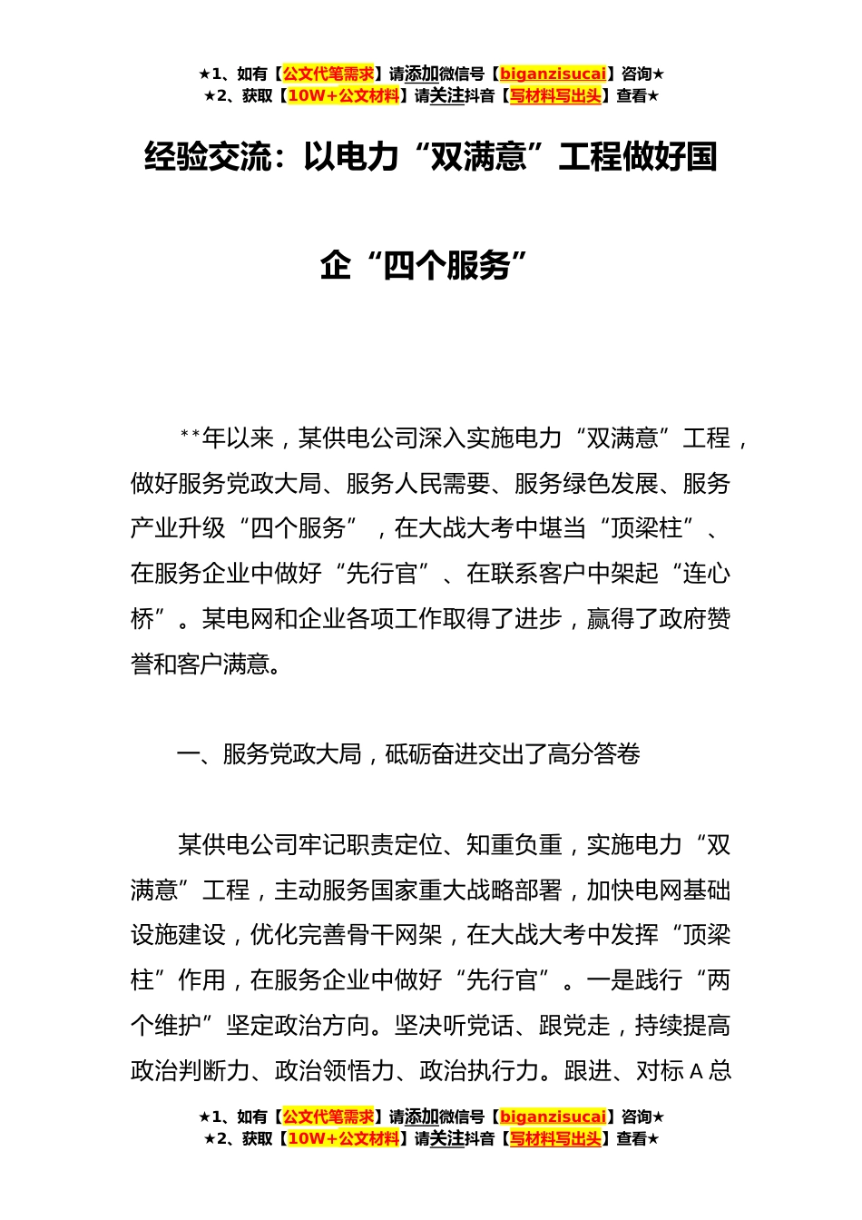 ★1、如有【公文代笔需求】请添加微信号【biganzisucai】咨询★★2、获取【10W+公文材料】请关注抖音【写材料写出头】查看★经验交流:以电力“双满意”工程做好国企“四个服务”**年以来,某供电公司深入实施电力“双满意”工程,做好服务党政大局、服务人民需要、服务绿色发展、服务产业升级“四个服务”,在大战大考中堪当“顶梁柱”、在服务企业中做好“先行官”、在联系客户中架起“连心桥”。某电网和企业各项工作取得了进步,赢得了政府赞誉和客户满意。一、服务党政大局,砥砺奋进交出了高分答卷某供电公司牢记职责定位、知重负重,实施电力“双满意”工程,主动服务国家重大战略部署,加快电网基础设施建设,优化完善骨干网架,在大战大考中发挥“顶梁柱”作用,在服务企业中做好“先行官”。一是践行“...