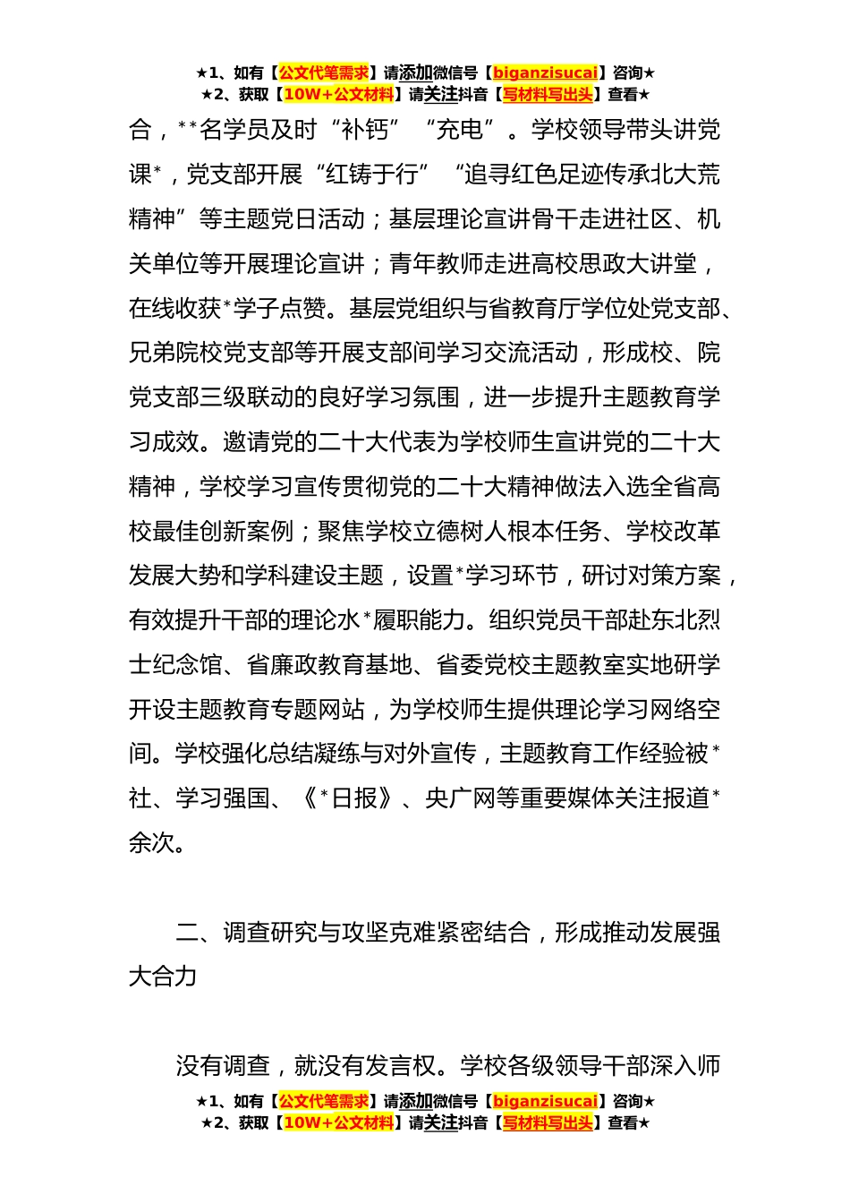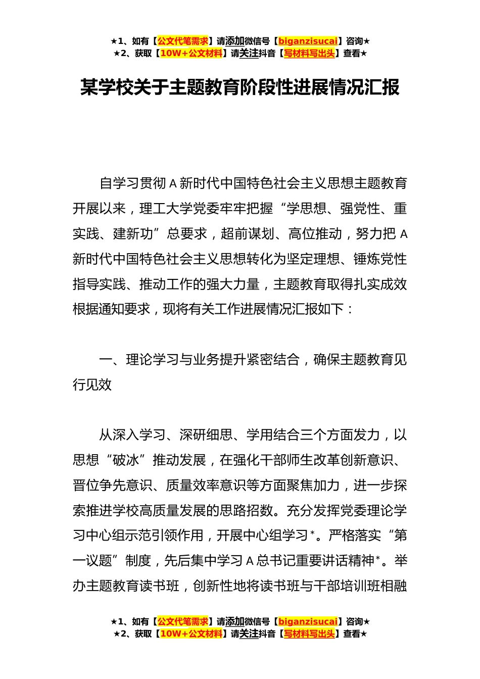 ★1、如有【公文代笔需求】请添加微信号【biganzisucai】咨询★★2、获取【10W+公文材料】请关注抖音【写材料写出头】查看★某学校关于主题教育阶段性进展情况汇报自学习贯彻A新时代中国特色社会主义思想主题教育开展以来,理工大学党委牢牢把握“学思想、强党性、重实践、建新功”总要求,超前谋划、高位推动,努力把A新时代中国特色社会主义思想转化为坚定理想、锤炼党性指导实践、推动工作的强大力量,主题教育取得扎实成效根据通知要求,现将有关工作进展情况汇报如下:一、理论学习与业务提升紧密结合,确保主题教育见行见效从深入学习、深研细思、学用结合三个方面发力,以思想“破冰”推动发展,在强化干部师生改革创新意识、晋位争先意识、质量效率意识等方面聚焦加力,进一步探索推进学校高质量发展的思...