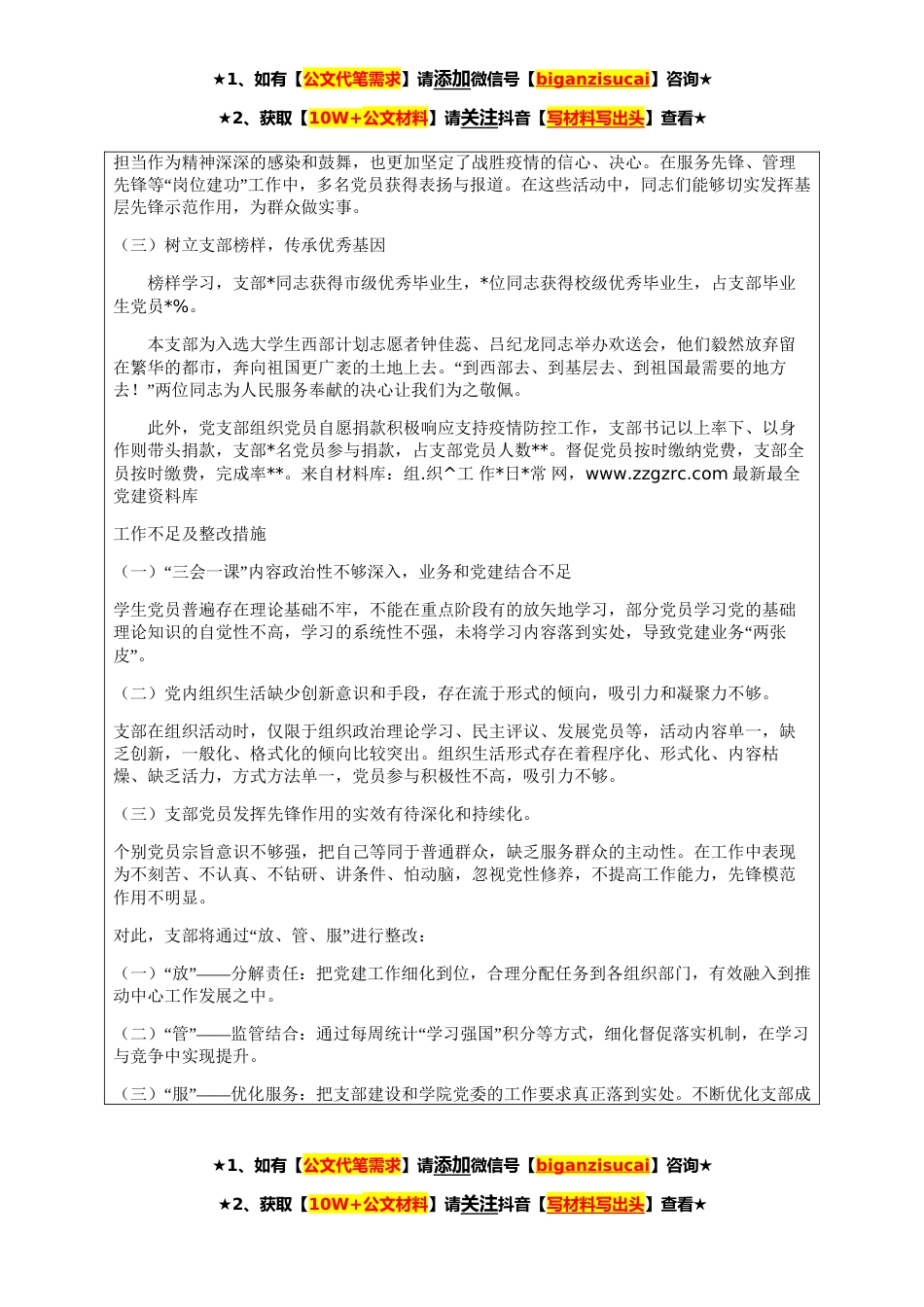 ★1、如有【公文代笔需求】请添加微信号【biganzisucai】咨询★★2、获取【10W+公文材料】请关注抖音【写材料写出头】查看★党员大会记录主要议题学生第四党支部**年度组织生活暨民主评议党员时间**年**日*:*地点***主持人张晓飞记录人张凯应到人数*实到人数*缺席名单及原因无缺席人员补课情况无一、会前准备根据学校组织部《关于召开**年度基层党支部组织生活会和开展民主评议党员的通知》和学院党委要求,学生第四党支部于今日召开**年度民主评议会。会前,支部做了充分的准备工作,一是集中组织党员进行一次专题学习研讨,为开好组织生活会、做好民主评议党员工作打牢思想基础。深入学习二十大精神,学习党章和《中国共产党组织工作条例》等党内法规;二是认真查摆问题。认真对照党章要求,结合学习情况,通过...
