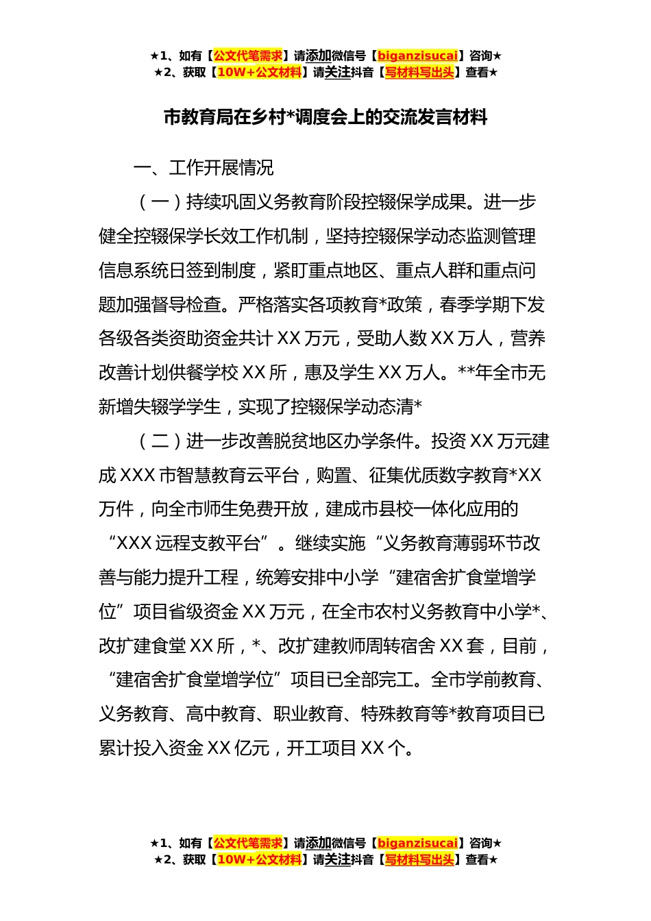 ★1、如有【公文代笔需求】请添加微信号【biganzisucai】咨询★★2、获取【10W+公文材料】请关注抖音【写材料写出头】查看★市教育局在乡村*调度会上的交流发言材料一、工作开展情况(一)持续巩固义务教育阶段控辍保学成果。进一步健全控辍保学长效工作机制,坚持控辍保学动态监测管理信息系统日签到制度,紧盯重点地区、重点人群和重点问题加强督导检查。严格落实各项教育*政策,春季学期下发各级各类资助资金共计XX万元,受助人数XX万人,营养改善计划供餐学校XX所,惠及学生XX万人。**年全市无新增失辍学学生,实现了控辍保学动态清*(二)进一步改善脱贫地区办学条件。投资XX万元建成XXX市智慧教育云平台,购置、征集优质数字教育*XX万件,向全市师生免费开放,建成市县校一体化应用的“XXX远程支教平台”。...