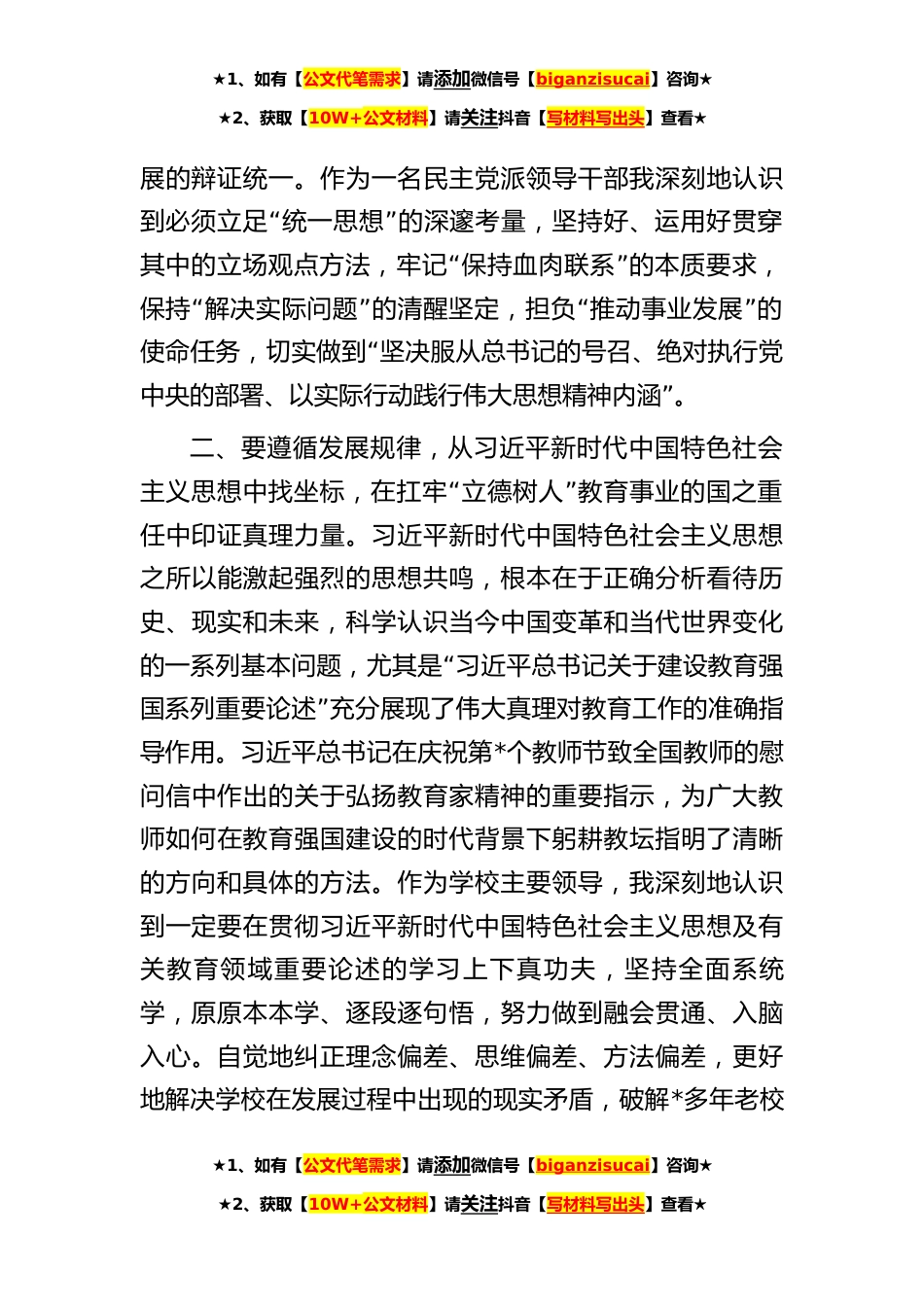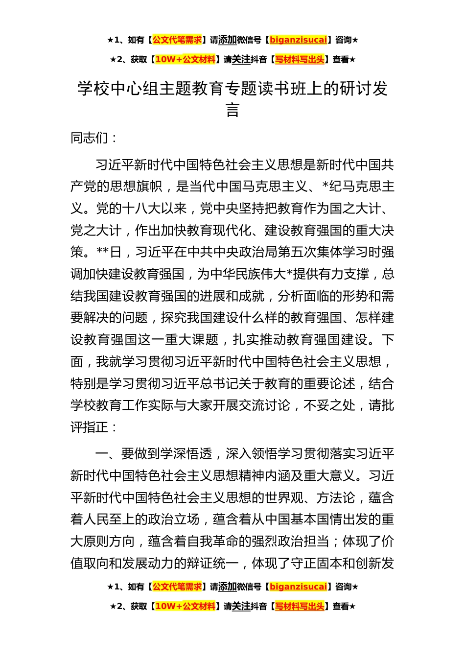 ★1、如有【公文代笔需求】请添加微信号【biganzisucai】咨询★★2、获取【10W+公文材料】请关注抖音【写材料写出头】查看★学校中心组主题教育专题读书班上的研讨发言同志们:习近平新时代中国特色社会主义思想是新时代中国共产党的思想旗帜,是当代中国马克思主义、*纪马克思主义。党的十八大以来,党中央坚持把教育作为国之大计、党之大计,作出加快教育现代化、建设教育强国的重大决策。**日,习近平在中共中央政治局第五次集体学习时强调加快建设教育强国,为中华民族伟大*提供有力支撑,总结我国建设教育强国的进展和成就,分析面临的形势和需要解决的问题,探究我国建设什么样的教育强国、怎样建设教育强国这一重大课题,扎实推动教育强国建设。下面,我就学习贯彻习近平新时代中国特色社会主义思想,特别...