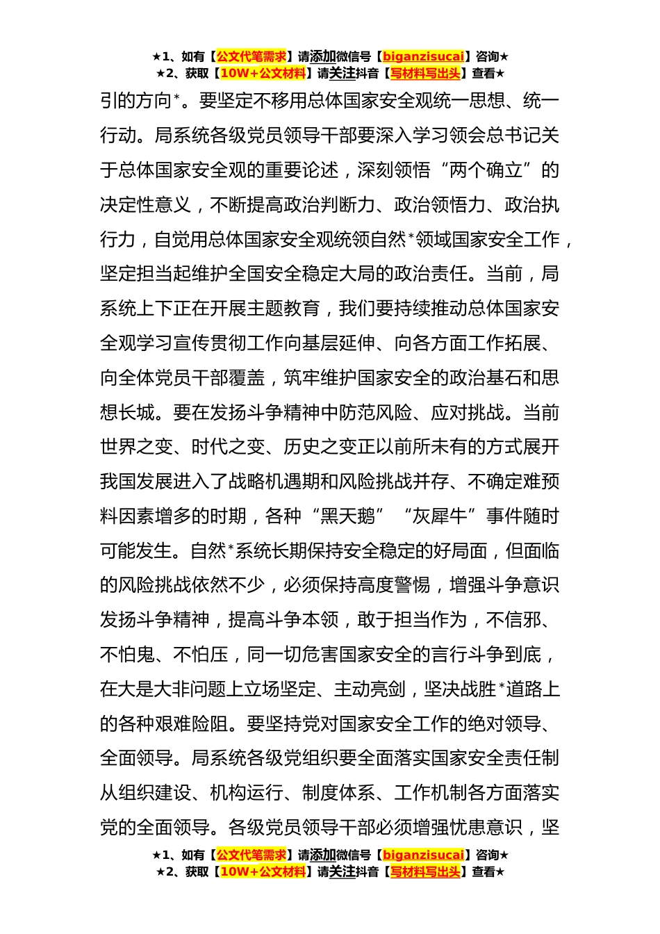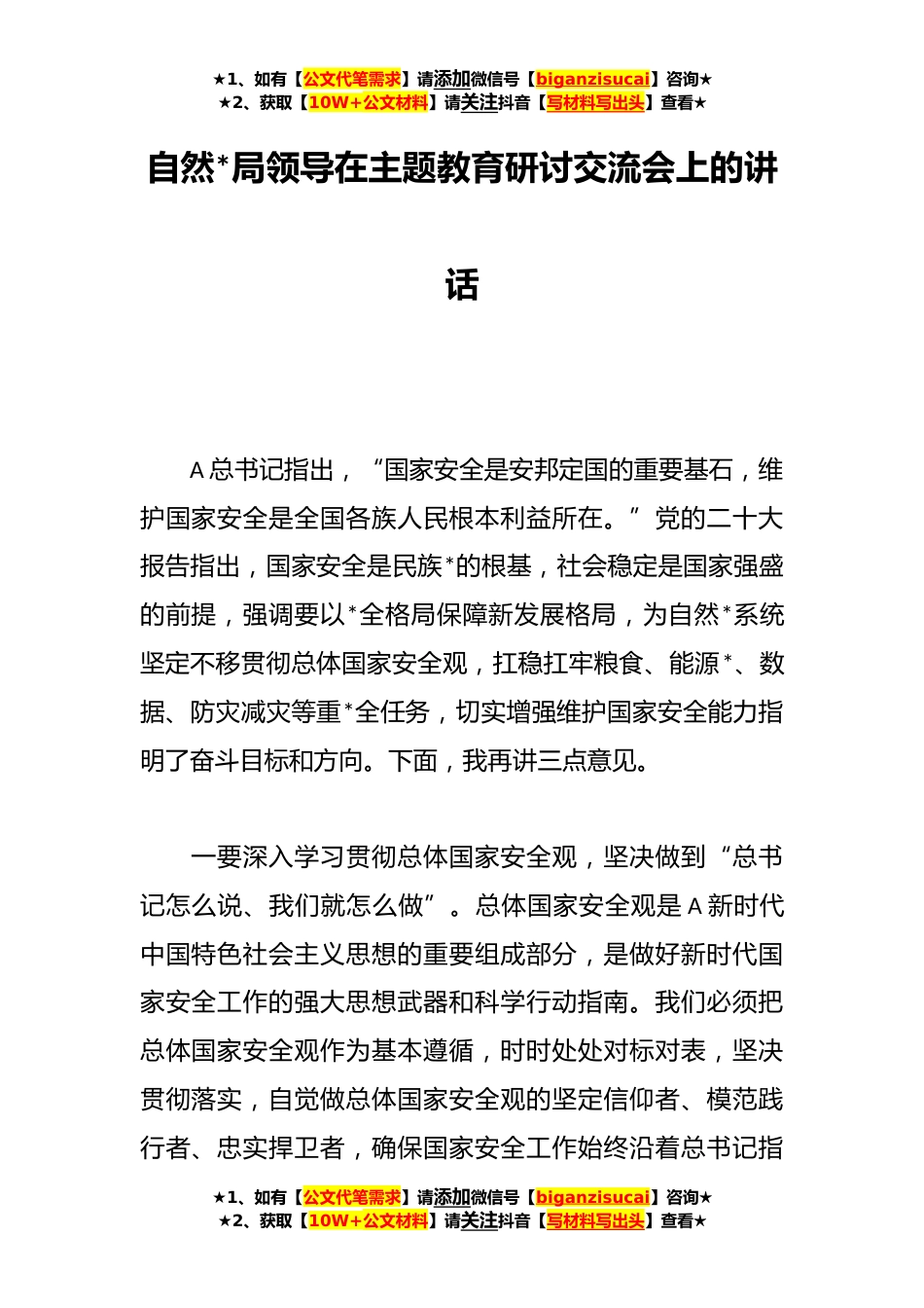 ★1、如有【公文代笔需求】请添加微信号【biganzisucai】咨询★★2、获取【10W+公文材料】请关注抖音【写材料写出头】查看★自然*局领导在主题教育研讨交流会上的讲话A总书记指出,“国家安全是安邦定国的重要基石,维护国家安全是全国各族人民根本利益所在。”党的二十大报告指出,国家安全是民族*的根基,社会稳定是国家强盛的前提,强调要以*全格局保障新发展格局,为自然*系统坚定不移贯彻总体国家安全观,扛稳扛牢粮食、能源*、数据、防灾减灾等重*全任务,切实增强维护国家安全能力指明了奋斗目标和方向。下面,我再讲三点意见。一要深入学习贯彻总体国家安全观,坚决做到“总书记怎么说、我们就怎么做”。总体国家安全观是A新时代中国特色社会主义思想的重要组成部分,是做好新时代国家安全工作的强大思想...
