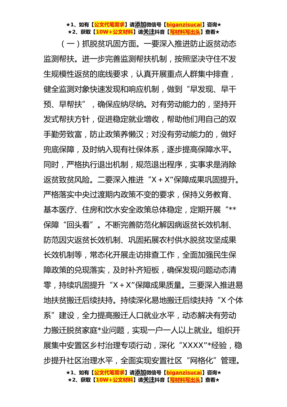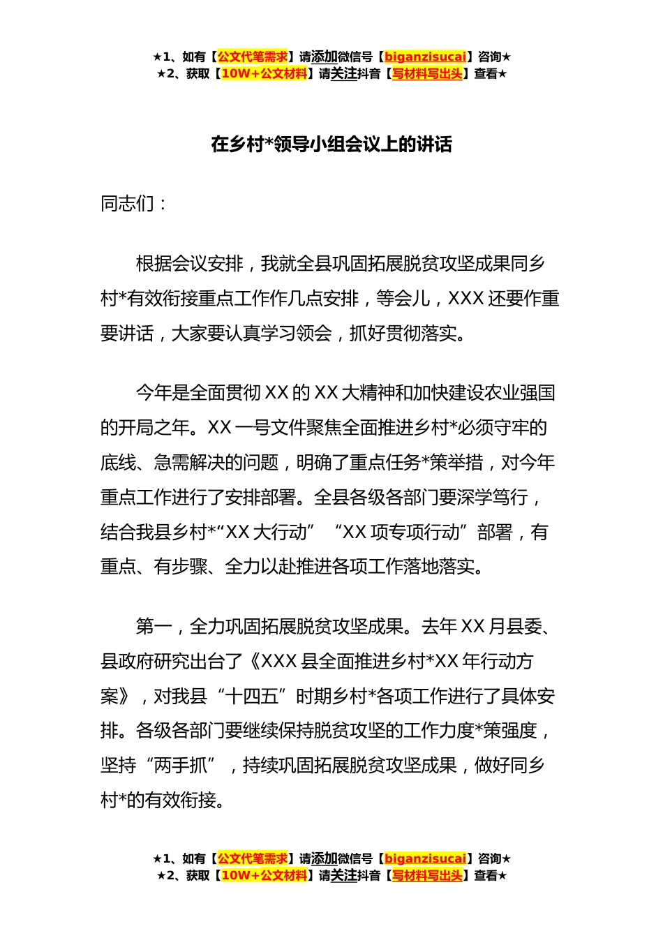 ★1、如有【公文代笔需求】请添加微信号【biganzisucai】咨询★★2、获取【10W+公文材料】请关注抖音【写材料写出头】查看★在乡村*领导小组会议上的讲话同志们:根据会议安排,我就全县巩固拓展脱贫攻坚成果同乡村*有效衔接重点工作作几点安排,等会儿,XXX还要作重要讲话,大家要认真学习领会,抓好贯彻落实。今年是全面贯彻XX的XX大精神和加快建设农业强国的开局之年。XX一号文件聚焦全面推进乡村*必须守牢的底线、急需解决的问题,明确了重点任务*策举措,对今年重点工作进行了安排部署。全县各级各部门要深学笃行,结合我县乡村*“XX大行动”“XX项专项行动”部署,有重点、有步骤、全力以赴推进各项工作落地落实。第一,全力巩固拓展脱贫攻坚成果。去年XX月县委、县政府研究出台了《XXX县全面推进乡村*XX年...