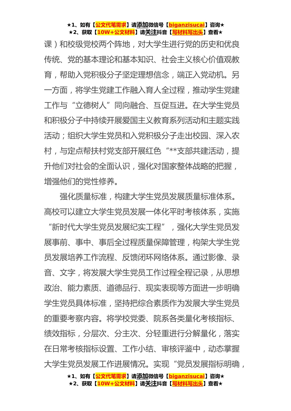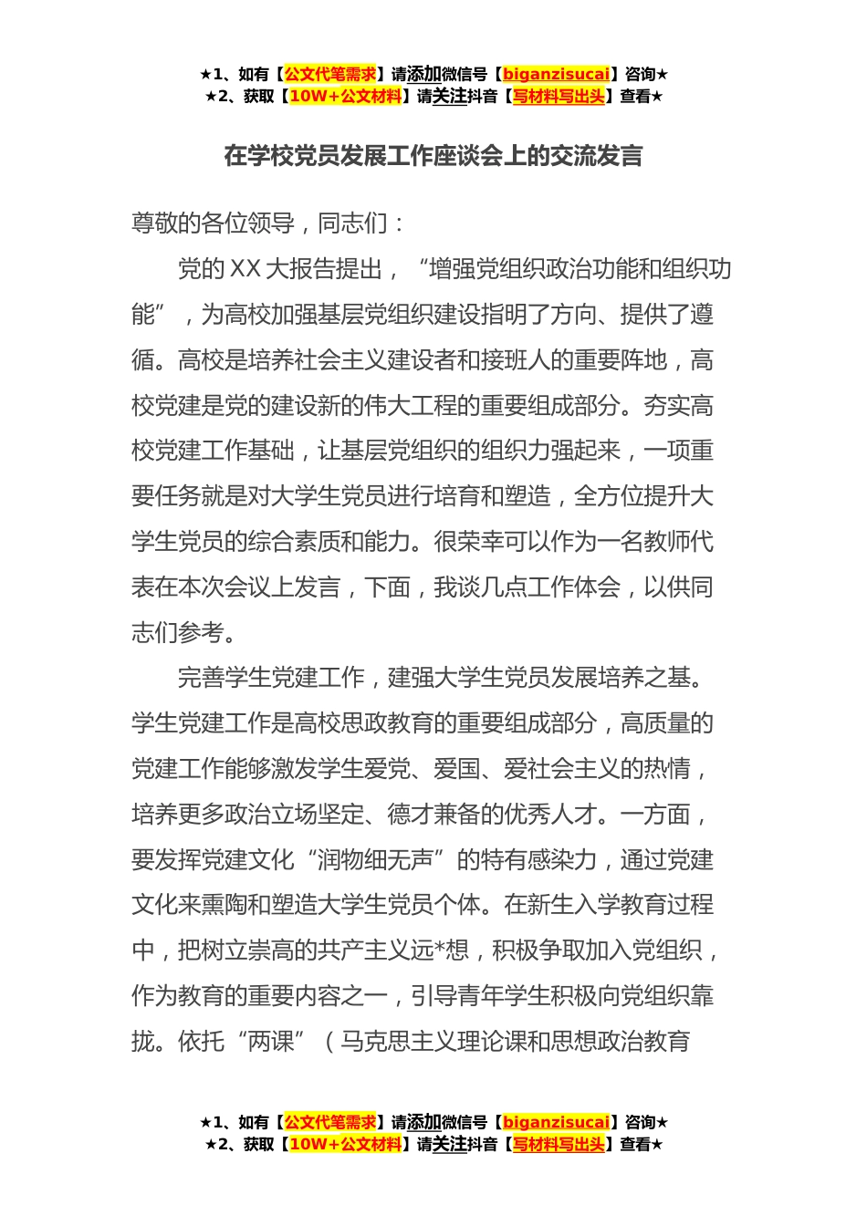 ★1、如有【公文代笔需求】请添加微信号【biganzisucai】咨询★★2、获取【10W+公文材料】请关注抖音【写材料写出头】查看★在学校党员发展工作座谈会上的交流发言尊敬的各位领导,同志们:党的XX大报告提出,“增强党组织政治功能和组织功能”,为高校加强基层党组织建设指明了方向、提供了遵循。高校是培养社会主义建设者和接班人的重要阵地,高校党建是党的建设新的伟大工程的重要组成部分。夯实高校党建工作基础,让基层党组织的组织力强起来,一项重要任务就是对大学生党员进行培育和塑造,全方位提升大学生党员的综合素质和能力。很荣幸可以作为一名教师代表在本次会议上发言,下面,我谈几点工作体会,以供同志们参考。完善学生党建工作,建强大学生党员发展培养之基。学生党建工作是高校思政教育的重要组...