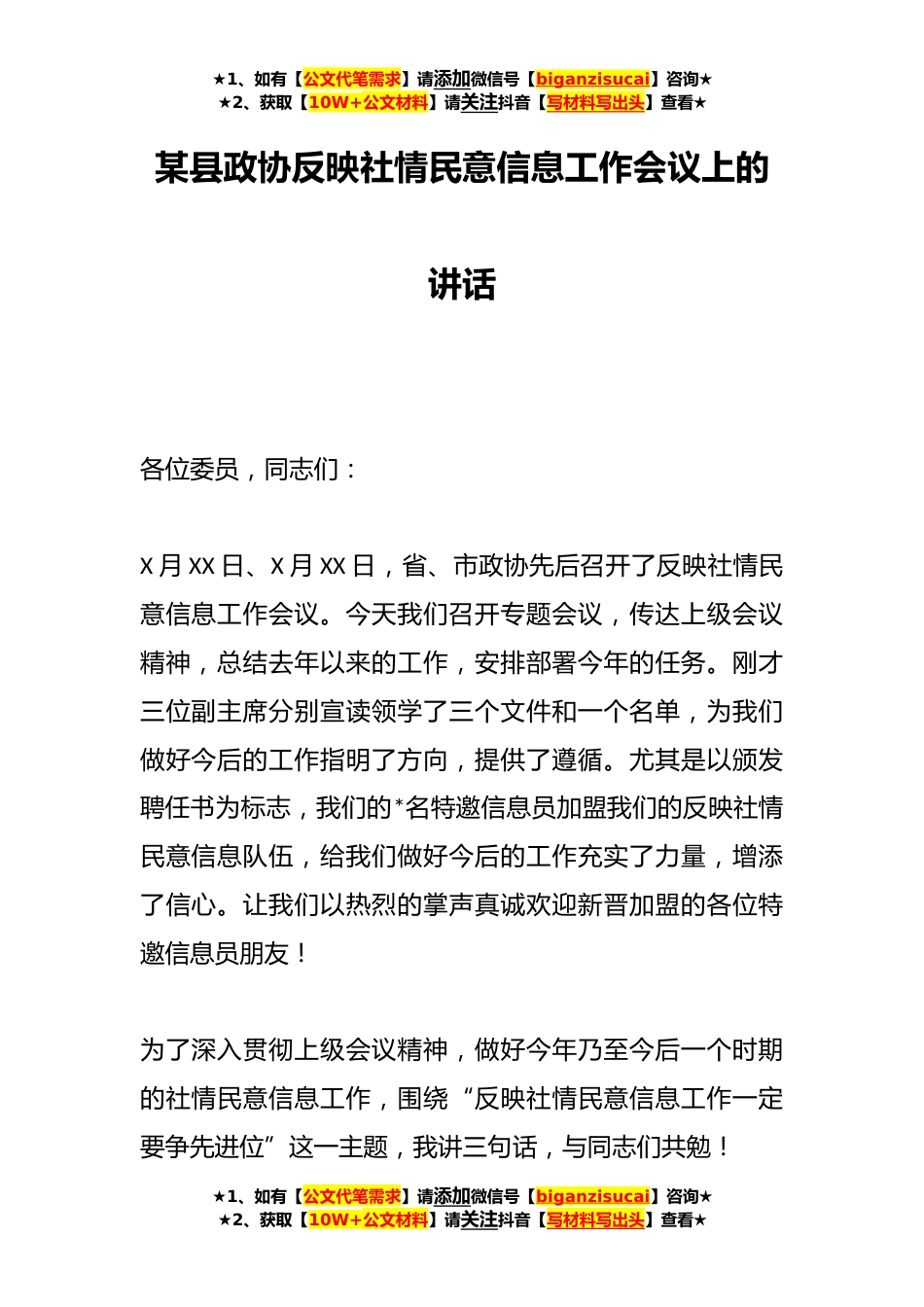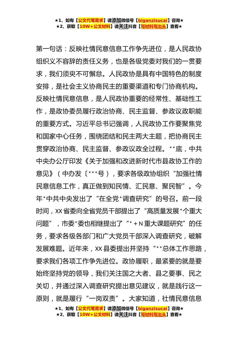 ★1、如有【公文代笔需求】请添加微信号【biganzisucai】咨询★★2、获取【10W+公文材料】请关注抖音【写材料写出头】查看★某县政协反映社情民意信息工作会议上的讲话各位委员,同志们:X月XX日、X月XX日,省、市政协先后召开了反映社情民意信息工作会议。今天我们召开专题会议,传达上级会议精神,总结去年以来的工作,安排部署今年的任务。刚才三位副主席分别宣读领学了三个文件和一个名单,为我们做好今后的工作指明了方向,提供了遵循。尤其是以颁发聘任书为标志,我们的*名特邀信息员加盟我们的反映社情民意信息队伍,给我们做好今后的工作充实了力量,增添了信心。让我们以热烈的掌声真诚欢迎新晋加盟的各位特邀信息员朋友!为了深入贯彻上级会议精神,做好今年乃至今后一个时期的社情民意信息工作,围绕“...