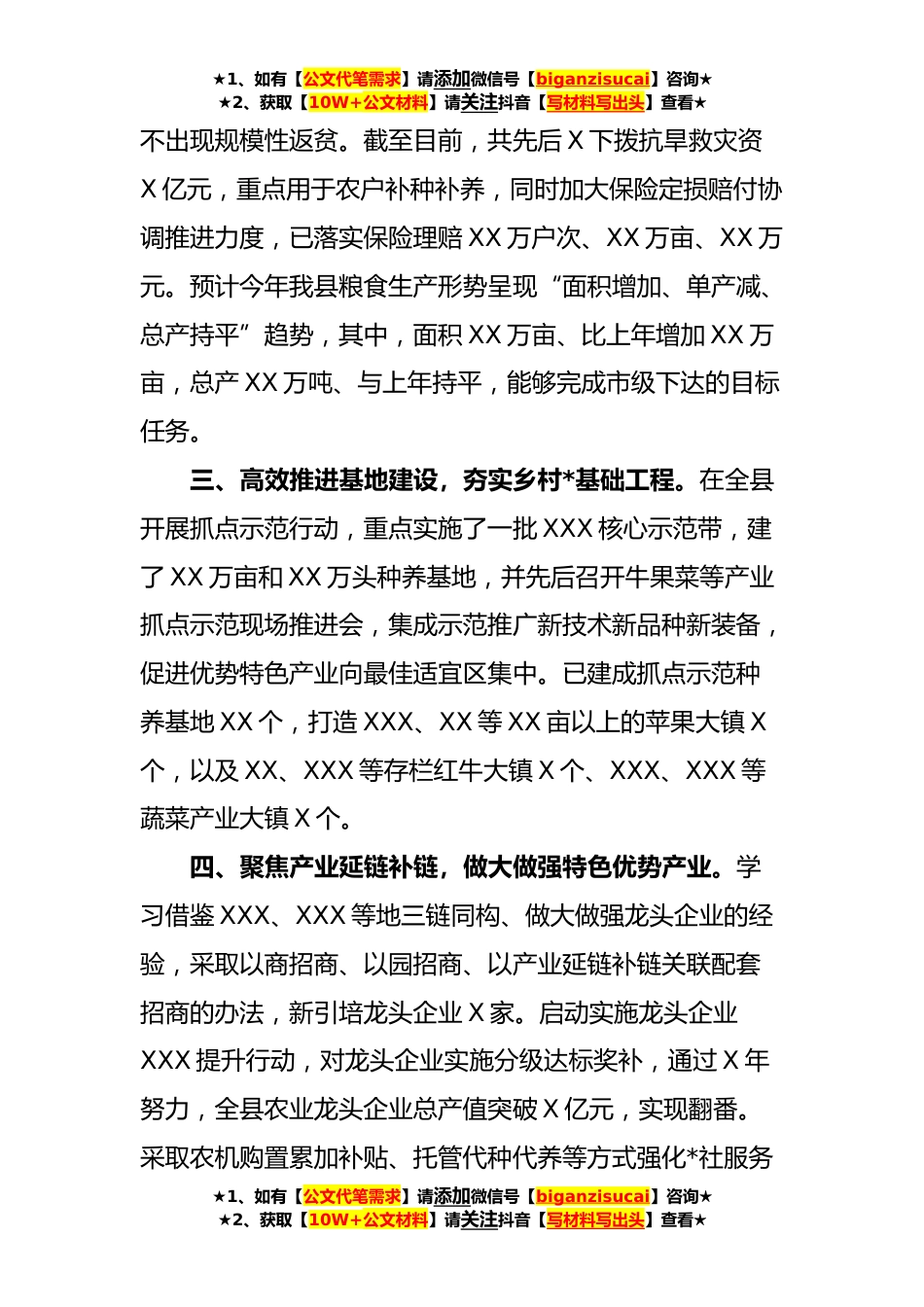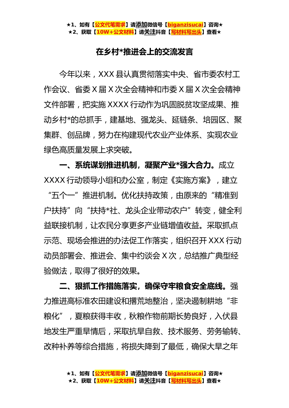 ★1、如有【公文代笔需求】请添加微信号【biganzisucai】咨询★★2、获取【10W+公文材料】请关注抖音【写材料写出头】查看★在乡村*推进会上的交流发言今年以来,XXX县认真贯彻落实中央、省市委农村工作会议、省委X届X次全会精神和市委X届X次全会精神文件部署,把实施XXXX行动作为巩固脱贫攻坚成果、推动乡村*的总抓手,建基地、强龙头、延链条、培园区、聚集群、创品牌,努力在构建现代农业产业体系、实现农业绿色高质量发展上求突破。一、系统谋划推进机制,凝聚产业*强大合力。成立XXXX行动领导小组和办公室,制定《实施方案》,建立“五个一”推进机制。优化扶持政策,由原来的“精准到户扶持”向“扶持*社、龙头企业带动农户”转变,健全利益联接机制,让农民分享更多产业链增值收益。采取抓点示范、现场会推...
