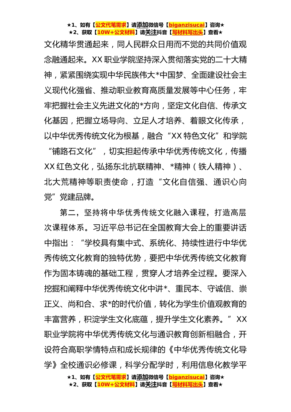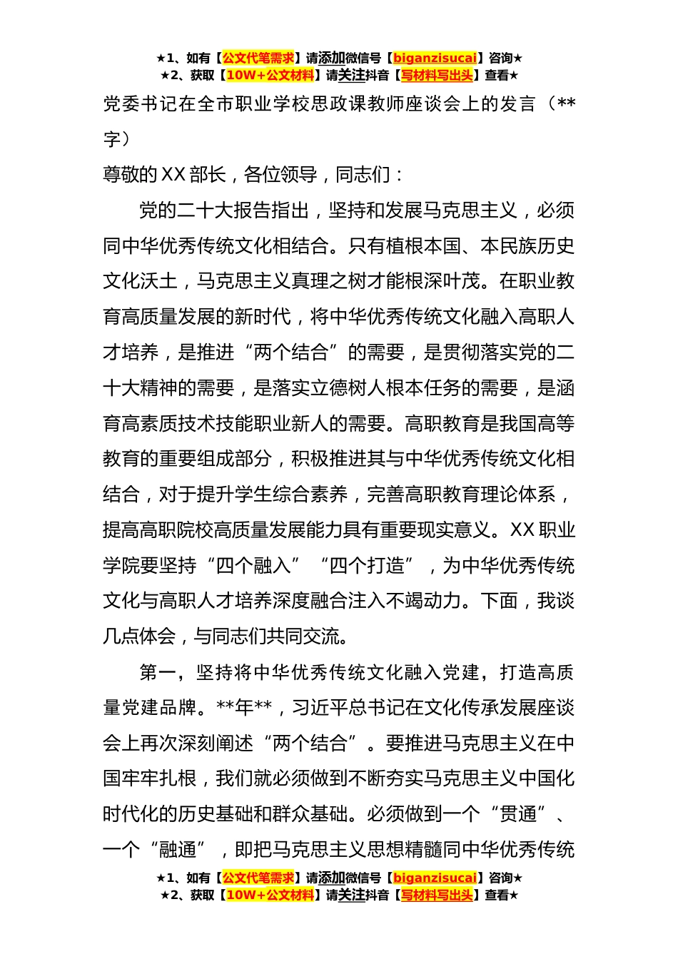 ★1、如有【公文代笔需求】请添加微信号【biganzisucai】咨询★★2、获取【10W+公文材料】请关注抖音【写材料写出头】查看★党委书记在全市职业学校思政课教师座谈会上的发言(**字)尊敬的XX部长,各位领导,同志们:党的二十大报告指出,坚持和发展马克思主义,必须同中华优秀传统文化相结合。只有植根本国、本民族历史文化沃土,马克思主义真理之树才能根深叶茂。在职业教育高质量发展的新时代,将中华优秀传统文化融入高职人才培养,是推进“两个结合”的需要,是贯彻落实党的二十大精神的需要,是落实立德树人根本任务的需要,是涵育高素质技术技能职业新人的需要。高职教育是我国高等教育的重要组成部分,积极推进其与中华优秀传统文化相结合,对于提升学生综合素养,完善高职教育理论体系,提高高职院校高...