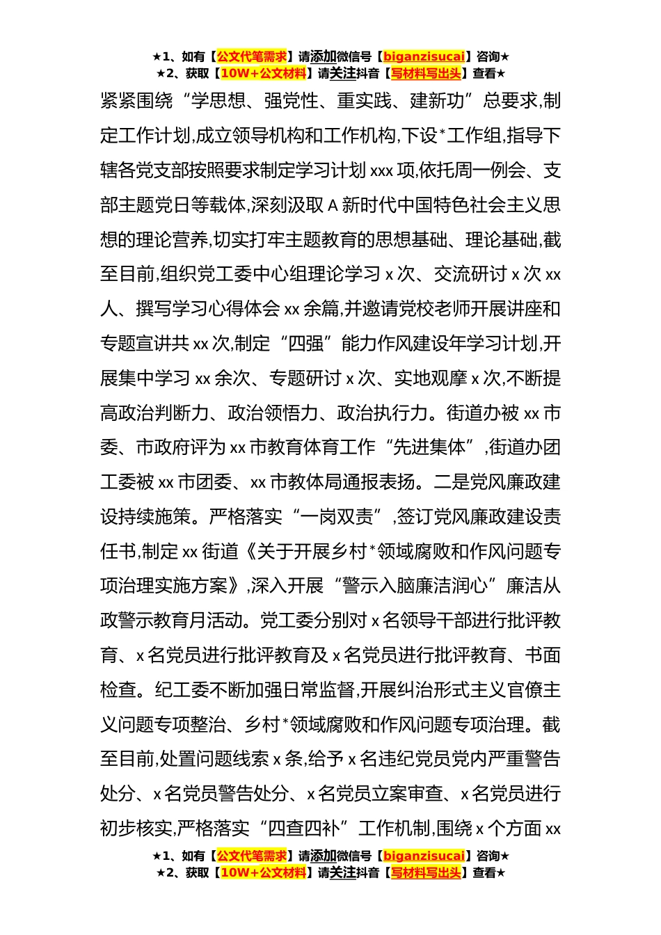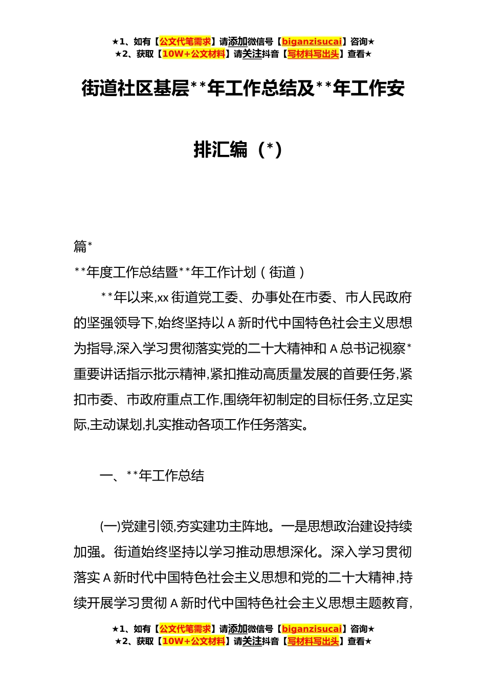 ★1、如有【公文代笔需求】请添加微信号【biganzisucai】咨询★★2、获取【10W+公文材料】请关注抖音【写材料写出头】查看★街道社区基层**年工作总结及**年工作安排汇编(*)篇***年度工作总结暨**年工作计划(街道)**年以来,xx街道党工委、办事处在市委、市人民政府的坚强领导下,始终坚持以A新时代中国特色社会主义思想为指导,深入学习贯彻落实党的二十大精神和A总书记视察*重要讲话指示批示精神,紧扣推动高质量发展的首要任务,紧扣市委、市政府重点工作,围绕年初制定的目标任务,立足实际,主动谋划,扎实推动各项工作任务落实。一、**年工作总结(一)党建引领,夯实建功主阵地。一是思想政治建设持续加强。街道始终坚持以学习推动思想深化。深入学习贯彻落实A新时代中国特色社会主义思想和党的二十大精神,持续开展...