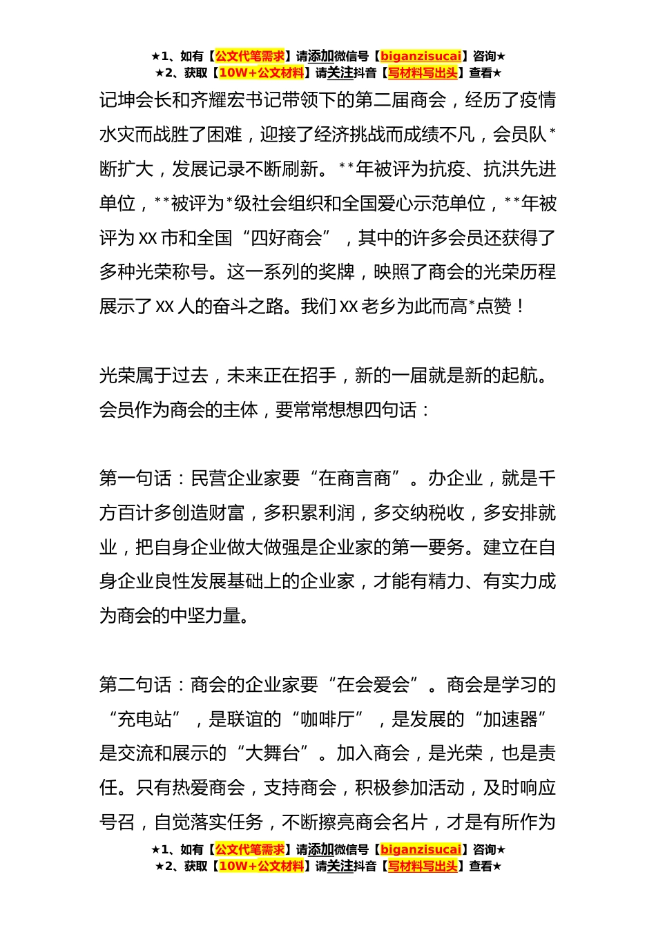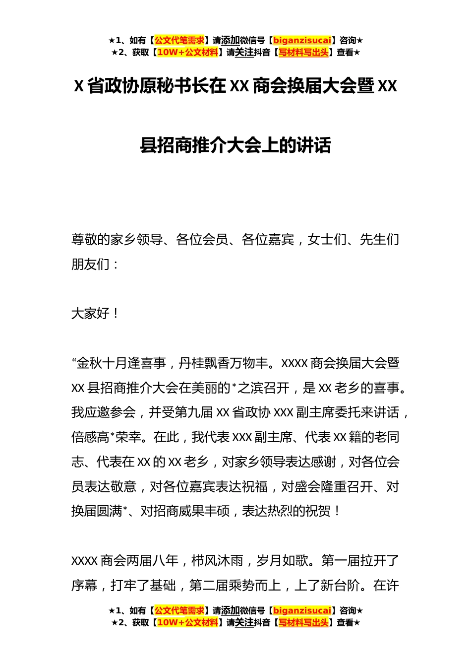 ★1、如有【公文代笔需求】请添加微信号【biganzisucai】咨询★★2、获取【10W+公文材料】请关注抖音【写材料写出头】查看★X省政协原秘书长在XX商会换届大会暨XX县招商推介大会上的讲话尊敬的家乡领导、各位会员、各位嘉宾,女士们、先生们朋友们:大家好!“金秋十月逢喜事,丹桂飘香万物丰。XXXX商会换届大会暨XX县招商推介大会在美丽的*之滨召开,是XX老乡的喜事。我应邀参会,并受第九届XX省政协XXX副主席委托来讲话,倍感高*荣幸。在此,我代表XXX副主席、代表XX籍的老同志、代表在XX的XX老乡,对家乡领导表达感谢,对各位会员表达敬意,对各位嘉宾表达祝福,对盛会隆重召开、对换届圆满*、对招商威果丰硕,表达热烈的祝贺!XXXX商会两届八年,栉风沐雨,岁月如歌。第一届拉开了序幕,打牢了基础,第二届乘...