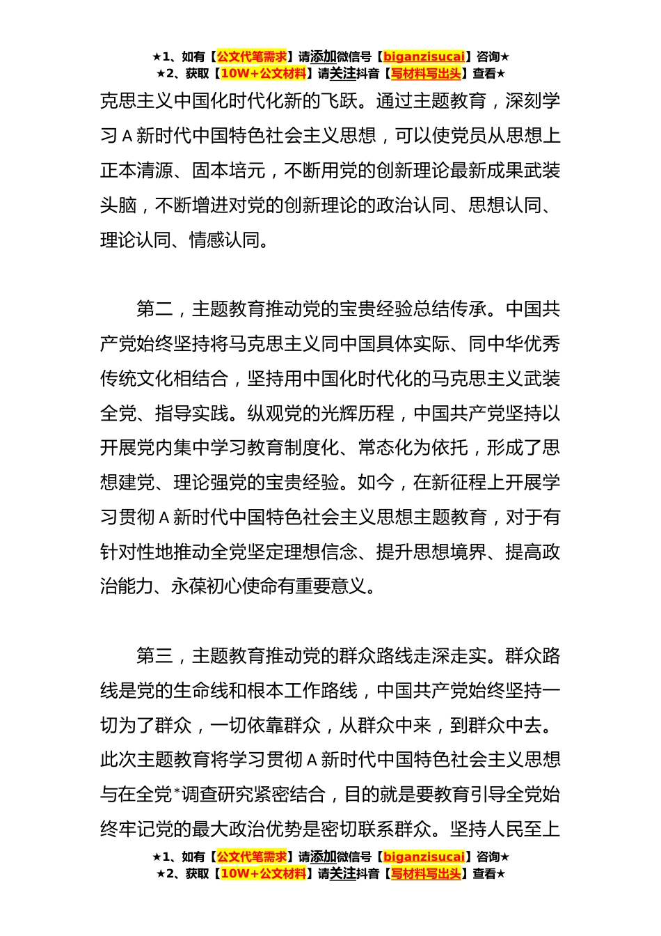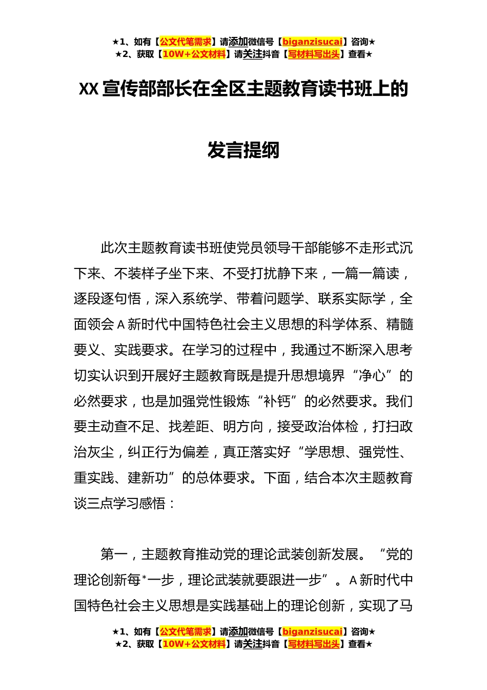 ★1、如有【公文代笔需求】请添加微信号【biganzisucai】咨询★★2、获取【10W+公文材料】请关注抖音【写材料写出头】查看★XX宣传部部长在全区主题教育读书班上的发言提纲此次主题教育读书班使党员领导干部能够不走形式沉下来、不装样子坐下来、不受打扰静下来,一篇一篇读,逐段逐句悟,深入系统学、带着问题学、联系实际学,全面领会A新时代中国特色社会主义思想的科学体系、精髓要义、实践要求。在学习的过程中,我通过不断深入思考切实认识到开展好主题教育既是提升思想境界“净心”的必然要求,也是加强党性锻炼“补钙”的必然要求。我们要主动查不足、找差距、明方向,接受政治体检,打扫政治灰尘,纠正行为偏差,真正落实好“学思想、强党性、重实践、建新功”的总体要求。下面,结合本次主题教育谈三点学...