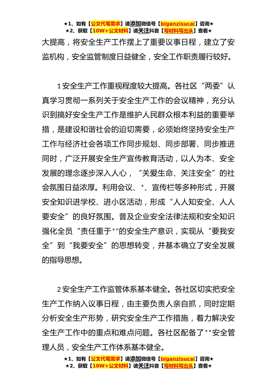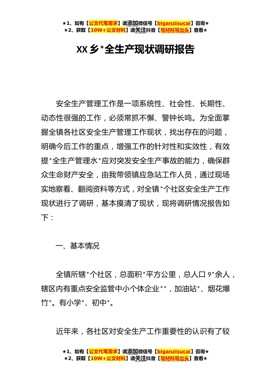 ★1、如有【公文代笔需求】请添加微信号【biganzisucai】咨询★★2、获取【10W+公文材料】请关注抖音【写材料写出头】查看★XX乡*全生产现状调研报告安全生产管理工作是一项系统性、社会性、长期性、动态性很强的工作,必须常抓不懈、警钟长鸣。为全面掌握全镇各社区安全生产管理工作现状,找出存在的问题,明确今后工作的重点,增强工作的针对性和实效性,有效提*全生产管理水*应对突发安全生产事故的能力,确保群众生命财产安全,由我带领镇应急站工作人员,通过现场实地察看、翻阅资料等方式,对全镇*个社区安全生产工作现状进行了调研,基本摸清了现状,现将调研情况报告如下:一、基本情况全镇所辖*个社区,总面积*平方公里,总人口9*余人,辖区内有重点安全监管中小个体企业**,加油站*、烟花爆竹*。有小学*...