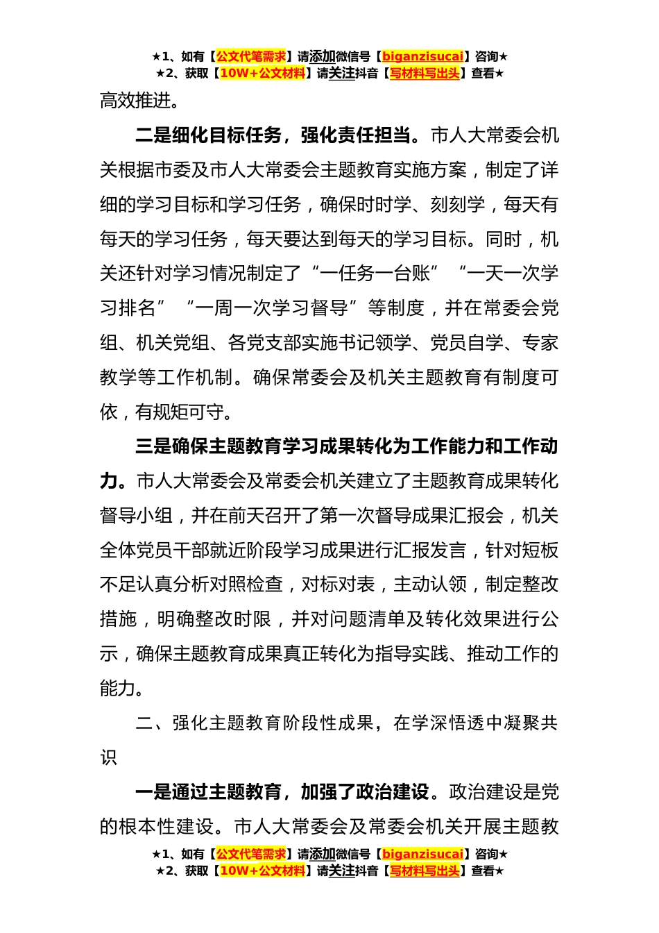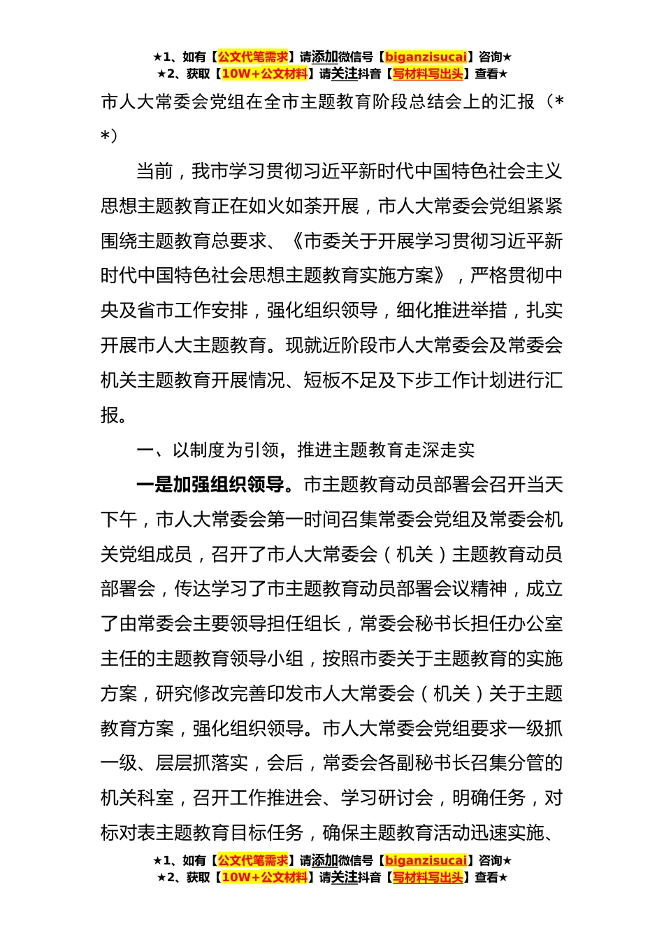 ★1、如有【公文代笔需求】请添加微信号【biganzisucai】咨询★★2、获取【10W+公文材料】请关注抖音【写材料写出头】查看★市人大常委会党组在全市主题教育阶段总结会上的汇报(**)当前,我市学习贯彻习近平新时代中国特色社会主义思想主题教育正在如火如荼开展,市人大常委会党组紧紧围绕主题教育总要求、《市委关于开展学习贯彻习近平新时代中国特色社会思想主题教育实施方案》,严格贯彻中央及省市工作安排,强化组织领导,细化推进举措,扎实开展市人大主题教育。现就近阶段市人大常委会及常委会机关主题教育开展情况、短板不足及下步工作计划进行汇报。一、以制度为引领,推进主题教育走深走实一是加强组织领导。市主题教育动员部署会召开当天下午,市人大常委会第一时间召集常委会党组及常委会机关党组成...