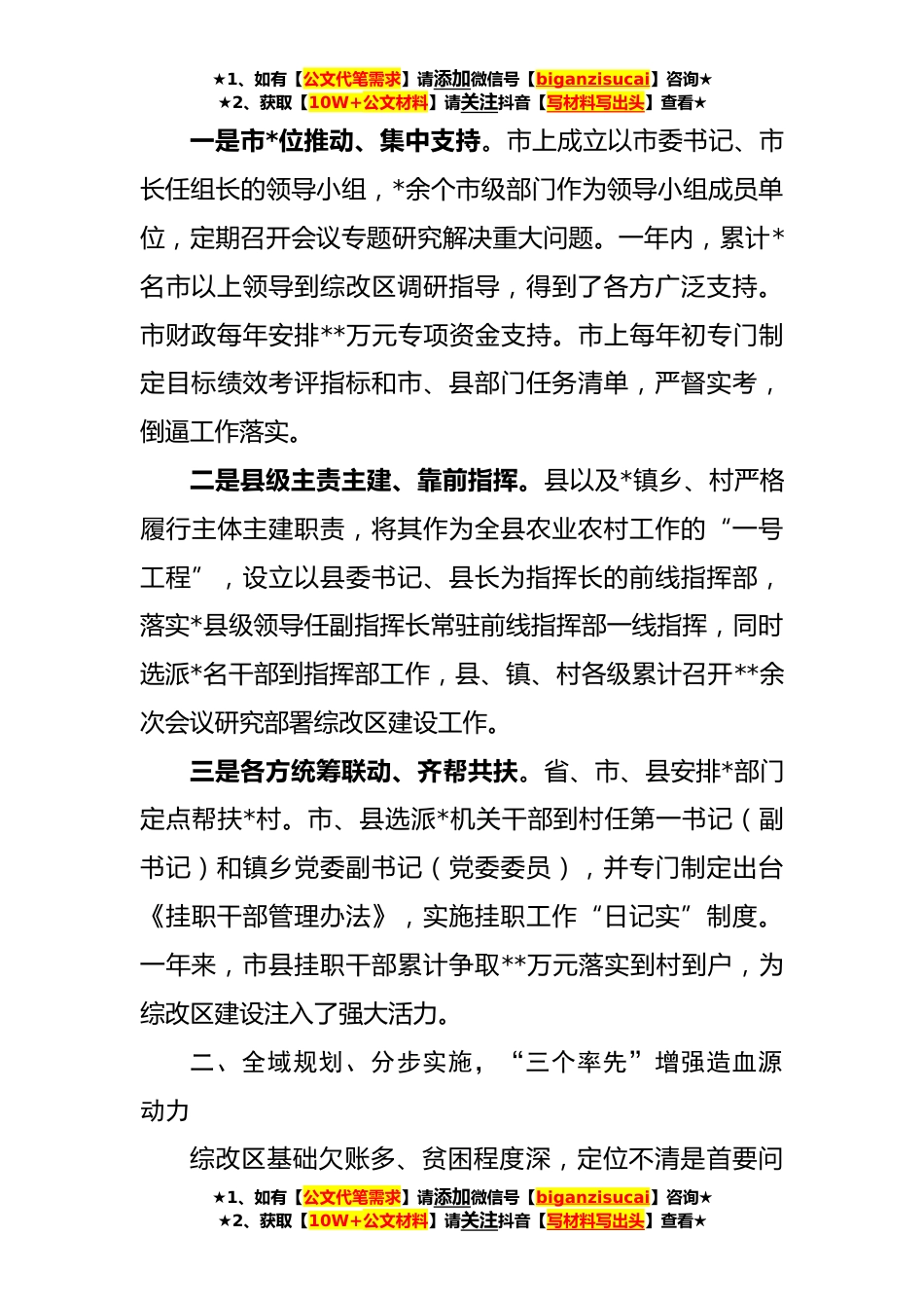 ★1、如有【公文代笔需求】请添加微信号【biganzisucai】咨询★★2、获取【10W+公文材料】请关注抖音【写材料写出头】查看★经验做法:“三力同发”推进乡村*示范区建设(**字)县是全省典型的丘区农业大县、人口大县,丘区面积占全县*%左右,贫困人口占全市*%,尤其是*深丘腹地,远离城市、基础较差,贫困发生率高达1*,发展整体滞后于全市全县。**年*,市委决定以县***方公里深丘腹地为范围设立“市丘区农村乡村*示范区(综改区)”,旨在通过改革创新、集中攻坚,探索丘陵地区乡村*、农村改革发展新路,确保共同*不落下一户一人。*正式启动以来短短一年时间,示范区完成投资3*元,重点区域率先发展,乡村面貌焕然一新,发展活力加速迸发,呈现出精准扶贫与区域发展融合互动的良好态势。《“三产融合、产村一体...