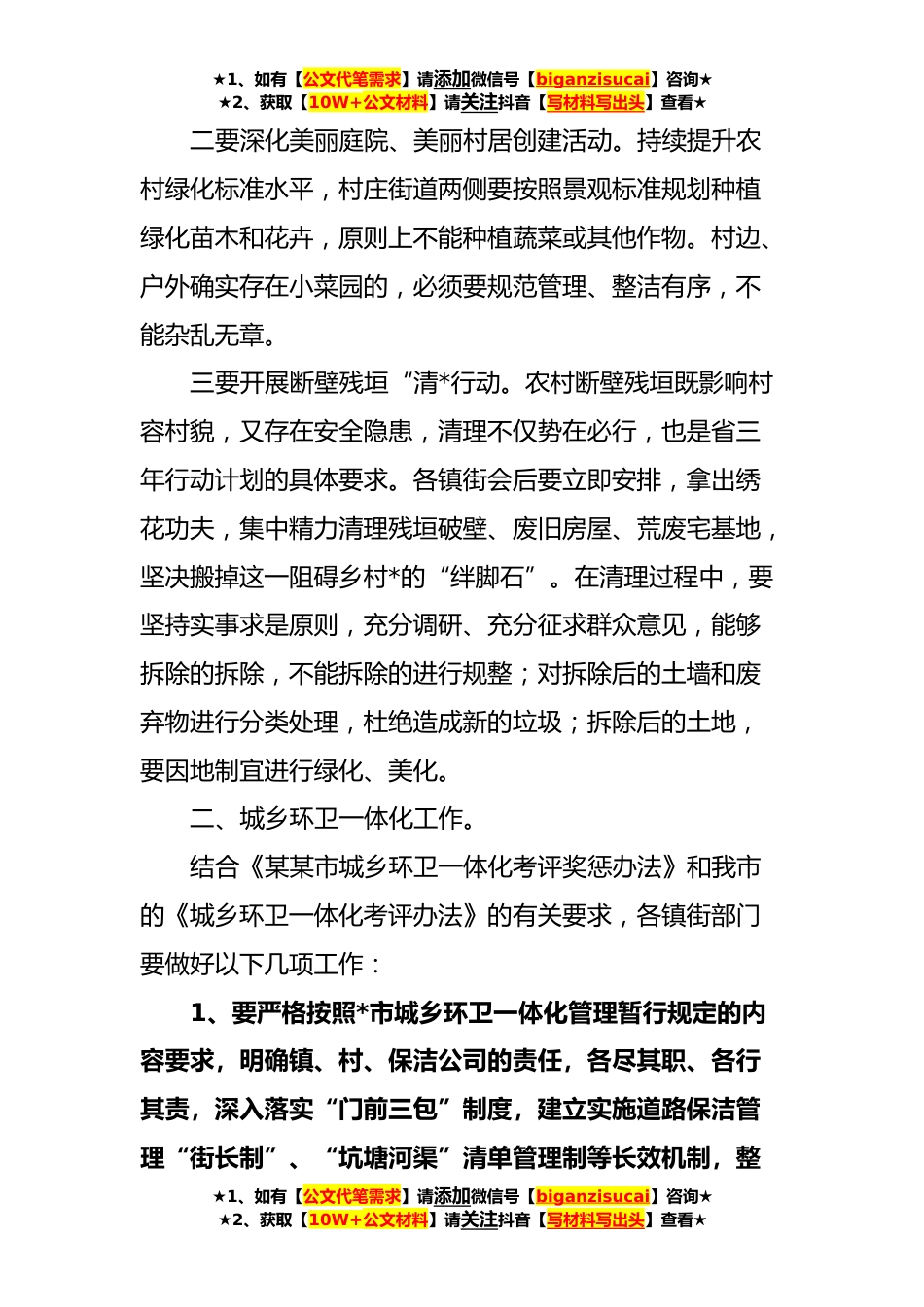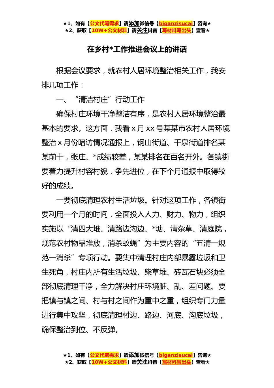 ★1、如有【公文代笔需求】请添加微信号【biganzisucai】咨询★★2、获取【10W+公文材料】请关注抖音【写材料写出头】查看★在乡村*工作推进会议上的讲话根据会议要求,就农村人居环境整治相关工作,我安排几项工作:一、“清洁村庄”行动工作确保村庄环境干净整洁有序,是农村人居环境整治最基本的要求。这方面,我看x月xx号某某市农村人居环境整治x月份暗访情况通报上,钢山街道、千泉街道排名某某前十,张庄、*成绩较差,某某排名在百名开外。各镇街要着力提升村容村貌,争先进位,在下个月通报中取得较好的成绩。一要彻底清理农村生活垃圾。针对这项工作,各镇街要利用一个月的时间,全面投入人力、财力、物力,组织实施以“清四大堆、清路边沟边、*塘、清杂草、清庭院,规范农村物品堆放,消杀蚊蝇”为主要内...