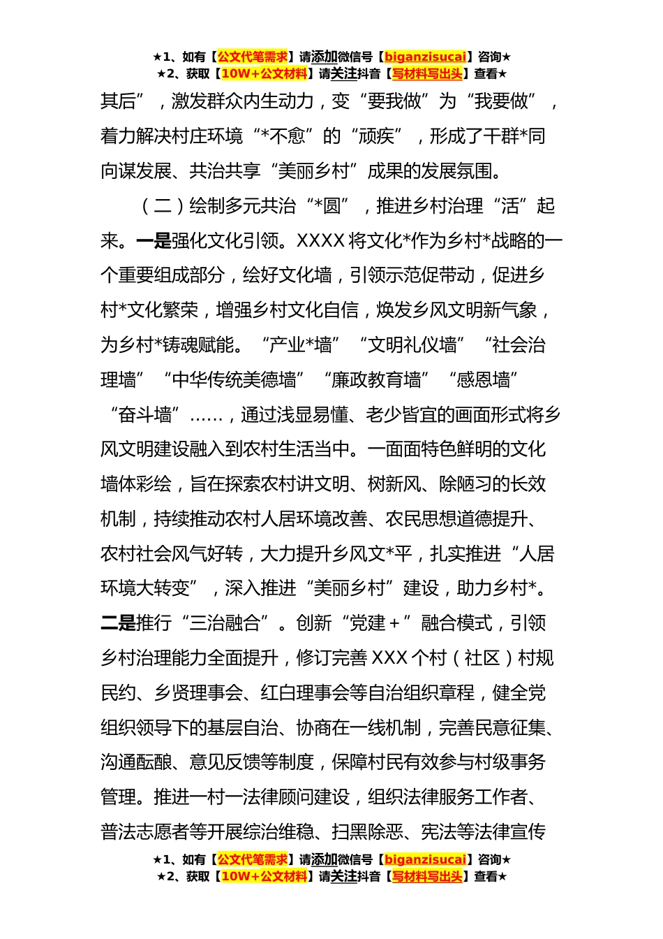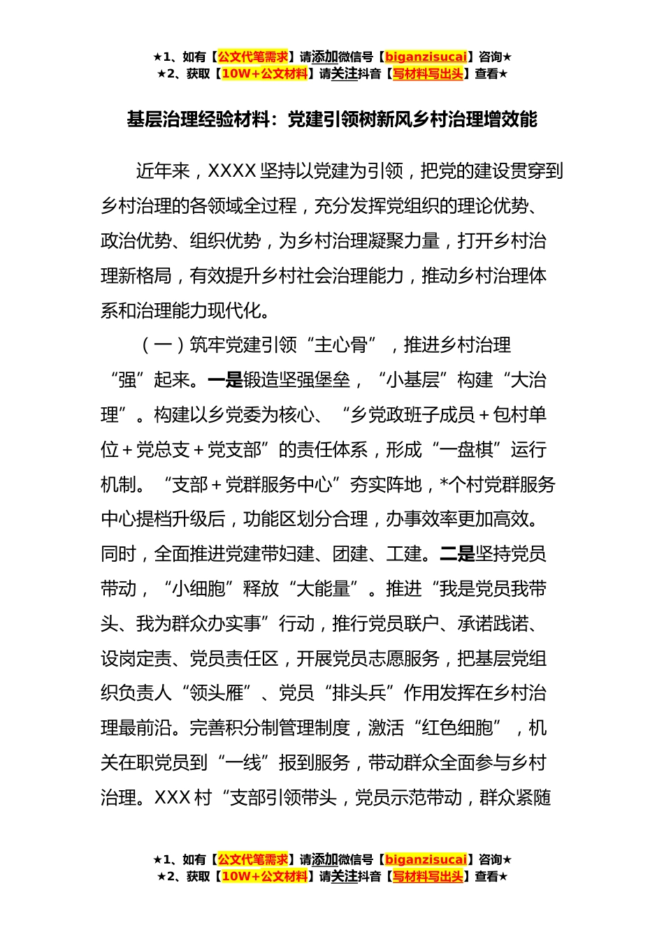 ★1、如有【公文代笔需求】请添加微信号【biganzisucai】咨询★★2、获取【10W+公文材料】请关注抖音【写材料写出头】查看★基层治理经验材料:党建引领树新风乡村治理增效能近年来,XXXX坚持以党建为引领,把党的建设贯穿到乡村治理的各领域全过程,充分发挥党组织的理论优势、政治优势、组织优势,为乡村治理凝聚力量,打开乡村治理新格局,有效提升乡村社会治理能力,推动乡村治理体系和治理能力现代化。(一)筑牢党建引领“主心骨”,推进乡村治理“强”起来。一是锻造坚强堡垒,“小基层”构建“大治理”。构建以乡党委为核心、“乡党政班子成员+包村单位+党总支+党支部”的责任体系,形成“一盘棋”运行机制。“支部+党群服务中心”夯实阵地,*个村党群服务中心提档升级后,功能区划分合理,办事效率更...