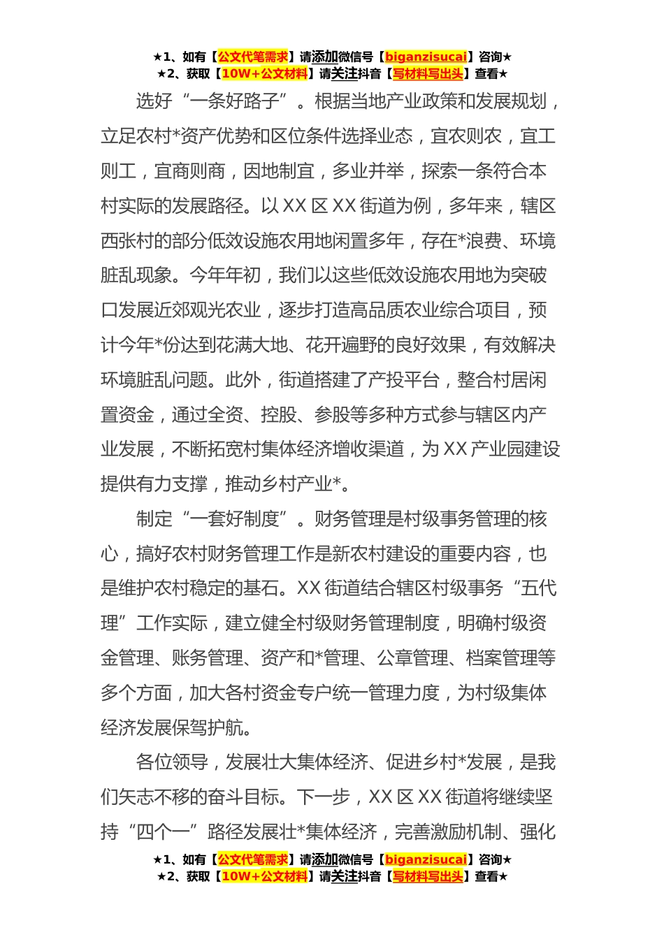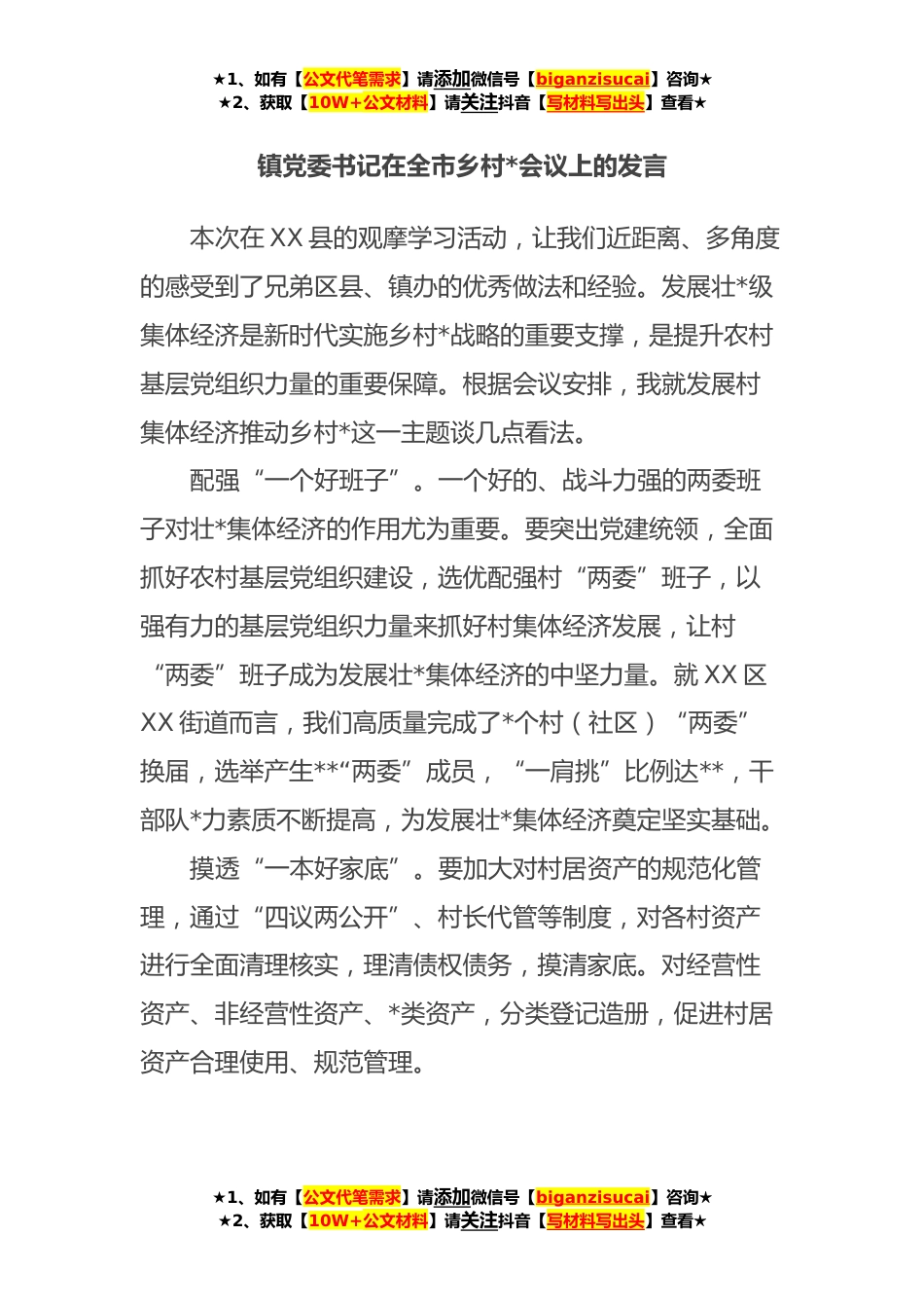 ★1、如有【公文代笔需求】请添加微信号【biganzisucai】咨询★★2、获取【10W+公文材料】请关注抖音【写材料写出头】查看★镇党委书记在全市乡村*会议上的发言本次在XX县的观摩学习活动,让我们近距离、多角度的感受到了兄弟区县、镇办的优秀做法和经验。发展壮*级集体经济是新时代实施乡村*战略的重要支撑,是提升农村基层党组织力量的重要保障。根据会议安排,我就发展村集体经济推动乡村*这一主题谈几点看法。配强“一个好班子”。一个好的、战斗力强的两委班子对壮*集体经济的作用尤为重要。要突出党建统领,全面抓好农村基层党组织建设,选优配强村“两委”班子,以强有力的基层党组织力量来抓好村集体经济发展,让村“两委”班子成为发展壮*集体经济的中坚力量。就XX区XX街道而言,我们高质量完成了*个村(...