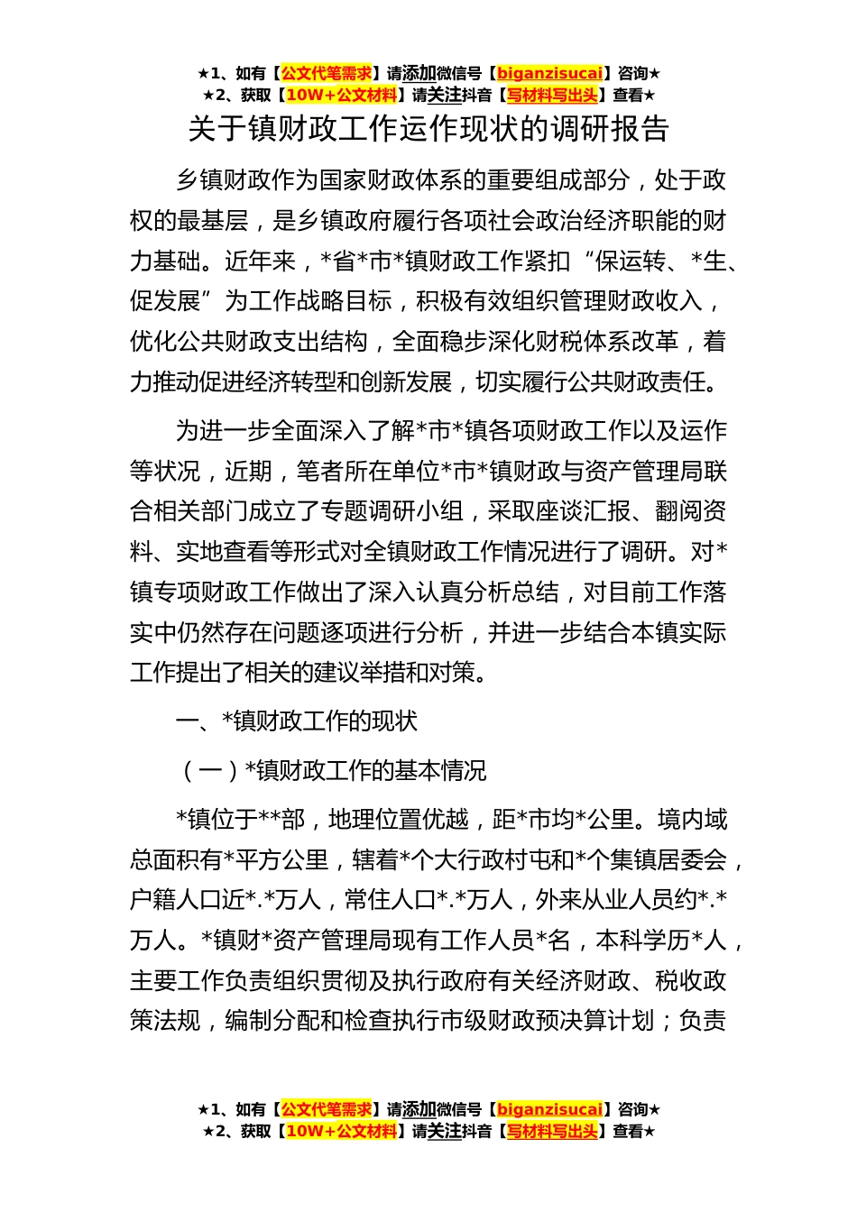 ★1、如有【公文代笔需求】请添加微信号【biganzisucai】咨询★★2、获取【10W+公文材料】请关注抖音【写材料写出头】查看★★1、如有【公文代笔需求】请添加微信号【biganzisucai】咨询★★2、获取【10W+公文材料】请关注抖音【写材料写出头】查看★★1、如有【公文代笔需求】请添加微信号【biganzisucai】咨询★★2、获取【10W+公文材料】请关注抖音【写材料写出头】查看★关于镇财政工作运作现状的调研报告乡镇财政作为国家财政体系的重要组成部分,处于政权的最基层,是乡镇政府履行各项社会政治经济职能的财力基础。近年来,*省*市*镇财政工作紧扣“保运转、*生、促发展”为工作战略目标,积极有效组织管理财政收入,优化公共财政支出结构,全面稳步深化财税体系改革,着力推动促进经济转型和创新发展,切实...