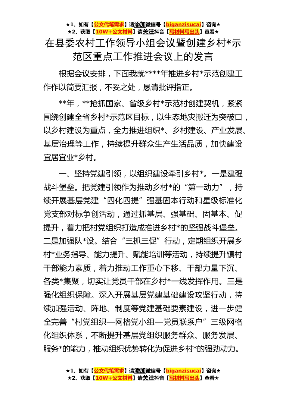 ★1、如有【公文代笔需求】请添加微信号【biganzisucai】咨询★★2、获取【10W+公文材料】请关注抖音【写材料写出头】查看★★1、如有【公文代笔需求】请添加微信号【biganzisucai】咨询★★2、获取【10W+公文材料】请关注抖音【写材料写出头】查看★★1、如有【公文代笔需求】请添加微信号【biganzisucai】咨询★★2、获取【10W+公文材料】请关注抖音【写材料写出头】查看★在县委农村工作领导小组会议暨创建乡村*示范区重点工作推进会议上的发言根据会议安排,下面我就****年推进乡村*示范创建工作作以简要汇报,不妥之处,恳请批评指正。**年,**抢抓国家、省级乡村*示范村创建契机,紧紧围绕创建全省乡村*示范区目标,以生态地灾搬迁为突破口,以乡村建设为重点,全力推进组织*、乡村建设、产业发展、基层治理...