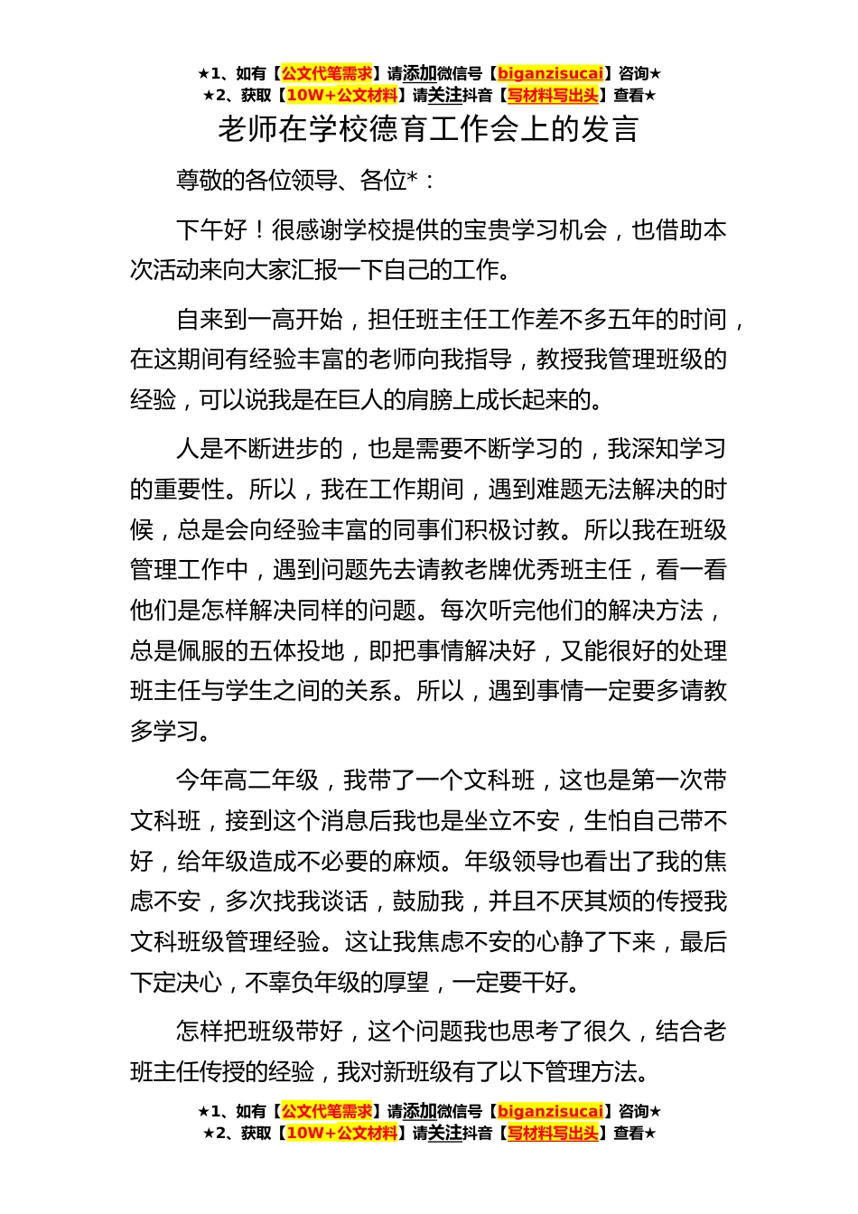 ★1、如有【公文代笔需求】请添加微信号【biganzisucai】咨询★★2、获取【10W+公文材料】请关注抖音【写材料写出头】查看★★1、如有【公文代笔需求】请添加微信号【biganzisucai】咨询★★2、获取【10W+公文材料】请关注抖音【写材料写出头】查看★★1、如有【公文代笔需求】请添加微信号【biganzisucai】咨询★★2、获取【10W+公文材料】请关注抖音【写材料写出头】查看★老师在学校德育工作会上的发言尊敬的各位领导、各位*:下午好!很感谢学校提供的宝贵学习机会,也借助本次活动来向大家汇报一下自己的工作。自来到一高开始,担任班主任工作差不多五年的时间,在这期间有经验丰富的老师向我指导,教授我管理班级的经验,可以说我是在巨人的肩膀上成长起来的。人是不断进步的,也是需要不断学习的,我深知学...