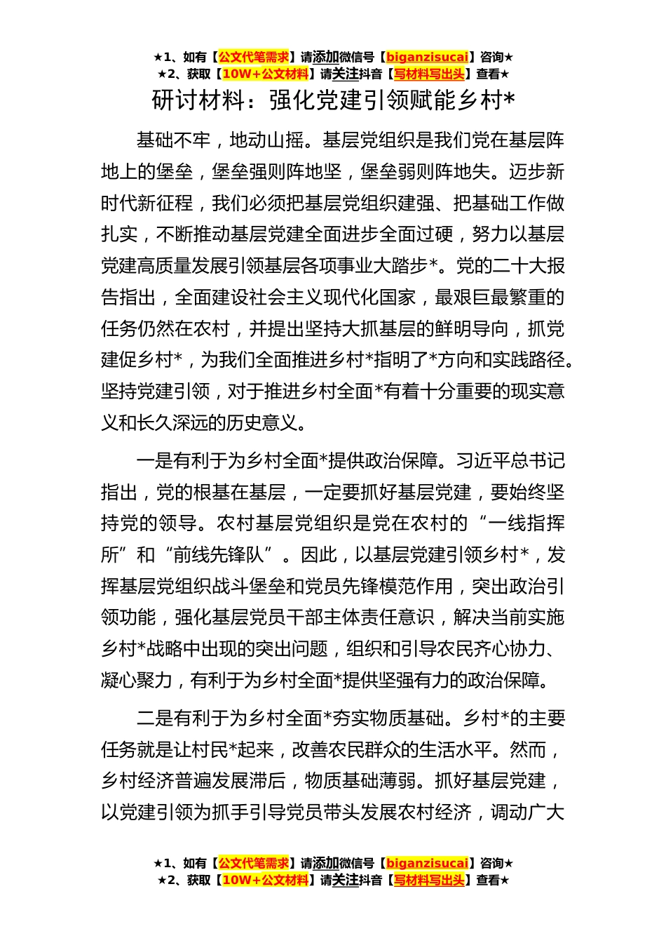 ★1、如有【公文代笔需求】请添加微信号【biganzisucai】咨询★★2、获取【10W+公文材料】请关注抖音【写材料写出头】查看★★1、如有【公文代笔需求】请添加微信号【biganzisucai】咨询★★2、获取【10W+公文材料】请关注抖音【写材料写出头】查看★★1、如有【公文代笔需求】请添加微信号【biganzisucai】咨询★★2、获取【10W+公文材料】请关注抖音【写材料写出头】查看★研讨材料:强化党建引领赋能乡村*基础不牢,地动山摇。基层党组织是我们党在基层阵地上的堡垒,堡垒强则阵地坚,堡垒弱则阵地失。迈步新时代新征程,我们必须把基层党组织建强、把基础工作做扎实,不断推动基层党建全面进步全面过硬,努力以基层党建高质量发展引领基层各项事业大踏步*。党的二十大报告指出,全面建设社会主义现代化国家,...