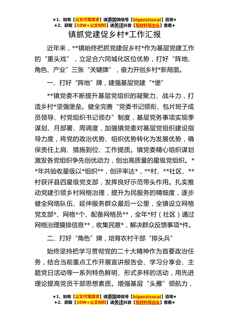 ★1、如有【公文代笔需求】请添加微信号【biganzisucai】咨询★★2、获取【10W+公文材料】请关注抖音【写材料写出头】查看★★1、如有【公文代笔需求】请添加微信号【biganzisucai】咨询★★2、获取【10W+公文材料】请关注抖音【写材料写出头】查看★★1、如有【公文代笔需求】请添加微信号【biganzisucai】咨询★★2、获取【10W+公文材料】请关注抖音【写材料写出头】查看★镇抓党建促乡村*工作汇报近年来,**镇始终把抓党建促乡村*作为基层党建工作的“重头戏”,立足合六同城化区位优势,打好“阵地、角色、产业”三张“关键牌”,奋力开创乡村*新局面。一、打好“阵地”牌,建强基层党建“*堡”**镇党委不断提升基层党组织的凝聚力、战斗力,打造乡村*坚强堡垒。健全完善“党委书记领衔、包片班子成员领导、村...