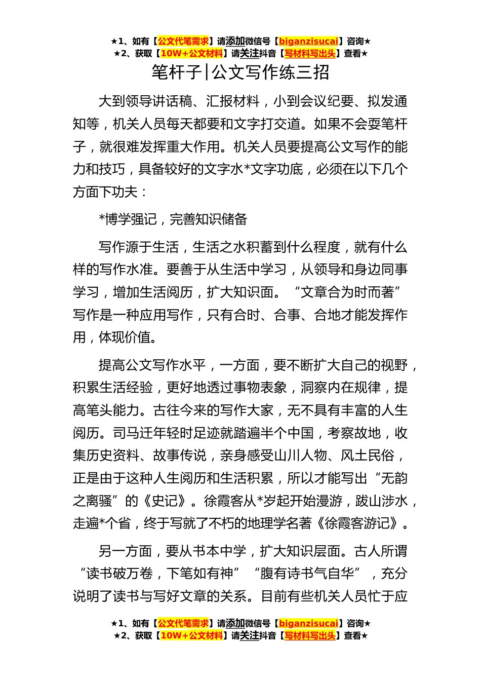 ★1、如有【公文代笔需求】请添加微信号【biganzisucai】咨询★★2、获取【10W+公文材料】请关注抖音【写材料写出头】查看★★1、如有【公文代笔需求】请添加微信号【biganzisucai】咨询★★2、获取【10W+公文材料】请关注抖音【写材料写出头】查看★★1、如有【公文代笔需求】请添加微信号【biganzisucai】咨询★★2、获取【10W+公文材料】请关注抖音【写材料写出头】查看★笔杆子|公文写作练三招大到领导讲话稿、汇报材料,小到会议纪要、拟发通知等,机关人员每天都要和文字打交道。如果不会耍笔杆子,就很难发挥重大作用。机关人员要提高公文写作的能力和技巧,具备较好的文字水*文字功底,必须在以下几个方面下功夫:*博学强记,完善知识储备写作源于生活,生活之水积蓄到什么程度,就有什么样的写作水准。要...