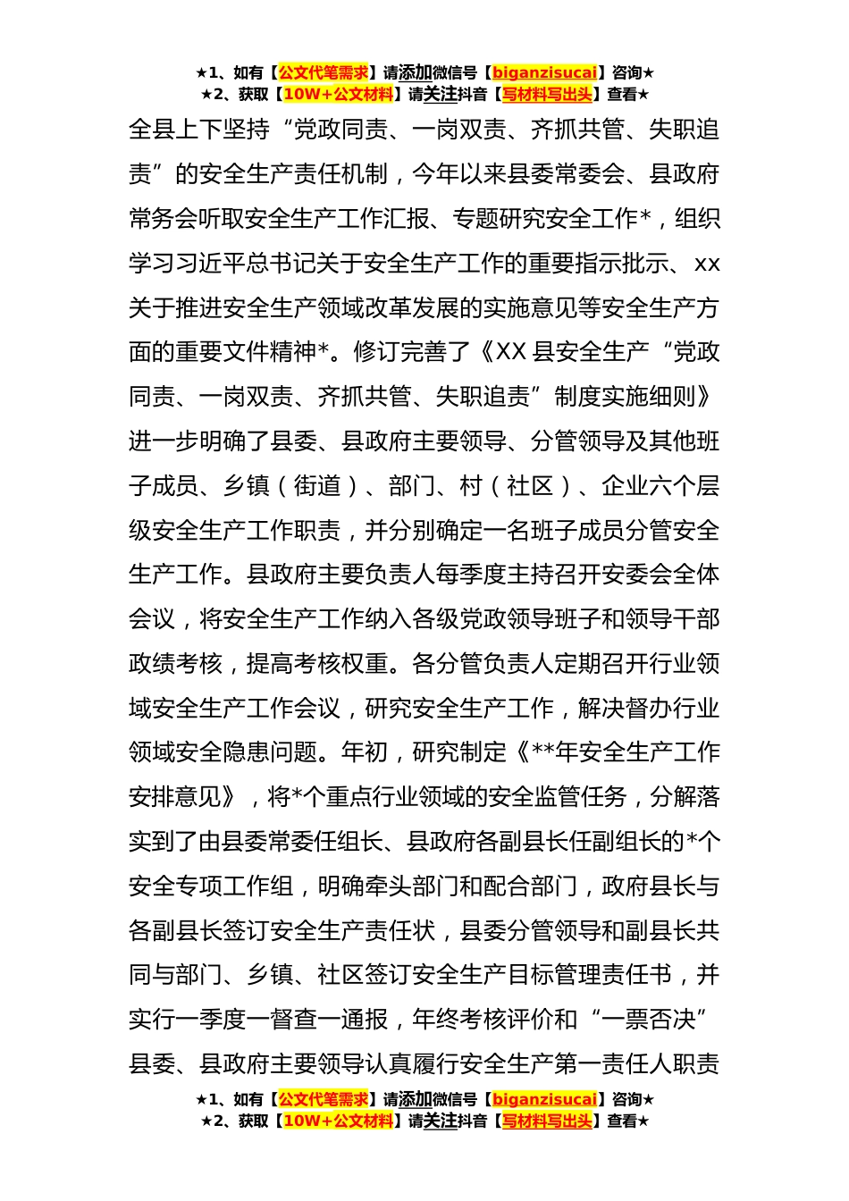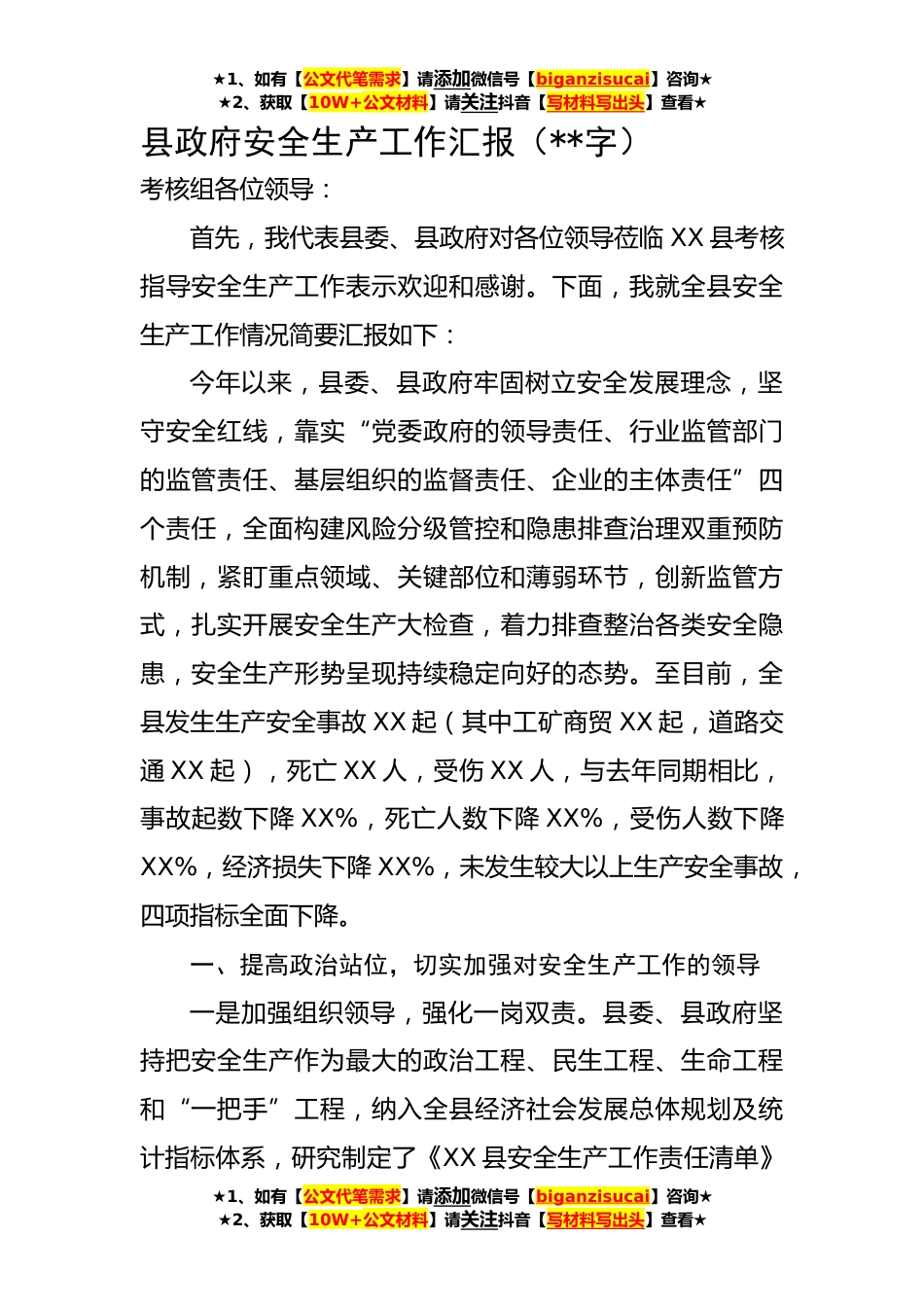 ★1、如有【公文代笔需求】请添加微信号【biganzisucai】咨询★★2、获取【10W+公文材料】请关注抖音【写材料写出头】查看★县政府安全生产工作汇报(**字)考核组各位领导:首先,我代表县委、县政府对各位领导莅临XX县考核指导安全生产工作表示欢迎和感谢。下面,我就全县安全生产工作情况简要汇报如下:今年以来,县委、县政府牢固树立安全发展理念,坚守安全红线,靠实“党委政府的领导责任、行业监管部门的监管责任、基层组织的监督责任、企业的主体责任”四个责任,全面构建风险分级管控和隐患排查治理双重预防机制,紧盯重点领域、关键部位和薄弱环节,创新监管方式,扎实开展安全生产大检查,着力排查整治各类安全隐患,安全生产形势呈现持续稳定向好的态势。至目前,全县发生生产安全事故XX起(其中工矿...