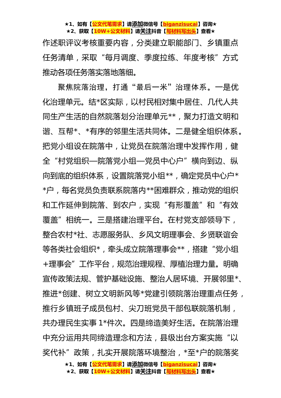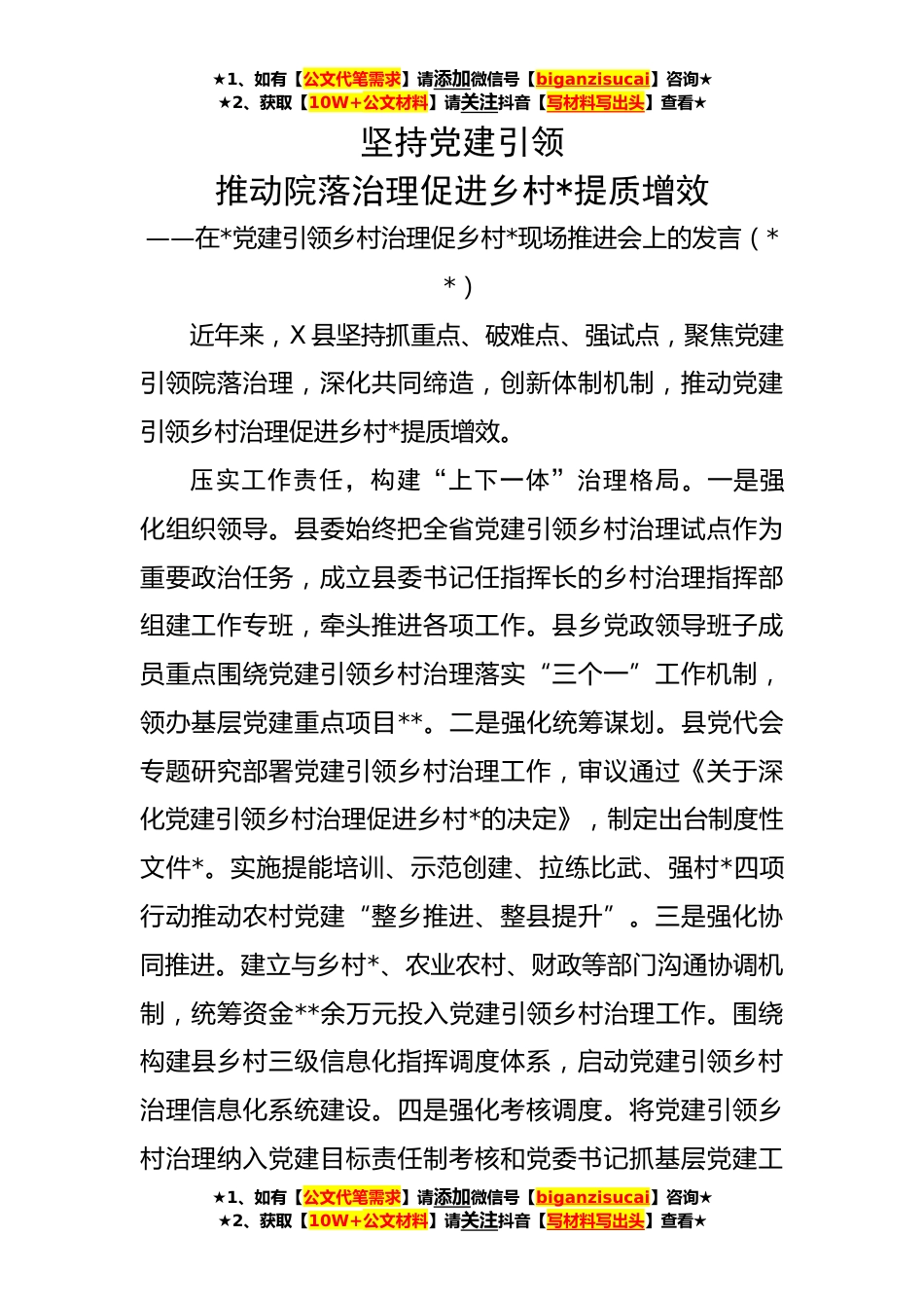 ★1、如有【公文代笔需求】请添加微信号【biganzisucai】咨询★★2、获取【10W+公文材料】请关注抖音【写材料写出头】查看★坚持党建引领推动院落治理促进乡村*提质增效——在*党建引领乡村治理促乡村*现场推进会上的发言(**)近年来,X县坚持抓重点、破难点、强试点,聚焦党建引领院落治理,深化共同缔造,创新体制机制,推动党建引领乡村治理促进乡村*提质增效。压实工作责任,构建“上下一体”治理格局。一是强化组织领导。县委始终把全省党建引领乡村治理试点作为重要政治任务,成立县委书记任指挥长的乡村治理指挥部组建工作专班,牵头推进各项工作。县乡党政领导班子成员重点围绕党建引领乡村治理落实“三个一”工作机制,领办基层党建重点项目**。二是强化统筹谋划。县党代会专题研究部署党建引领乡村治理...