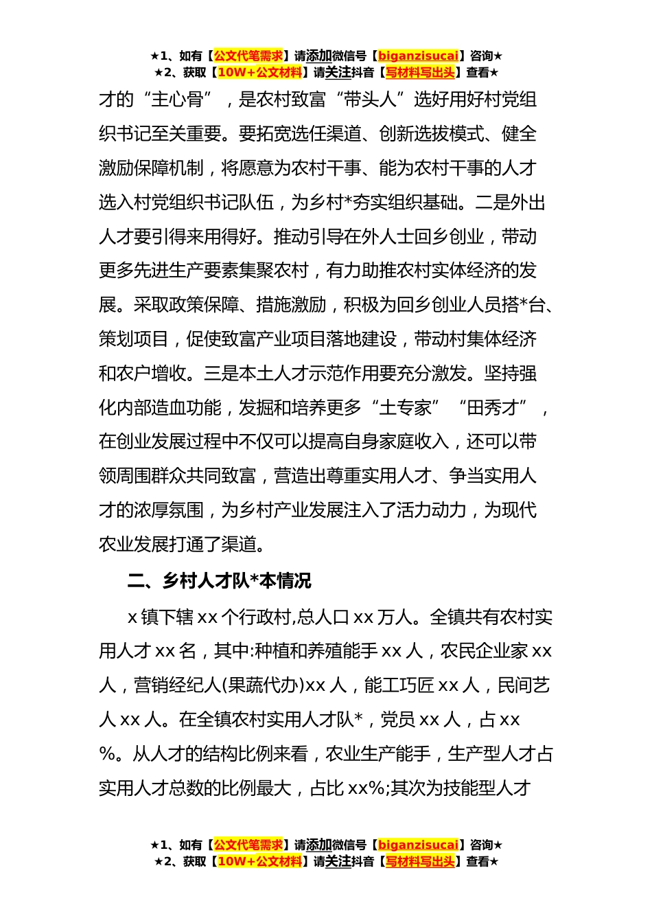 ★1、如有【公文代笔需求】请添加微信号【biganzisucai】咨询★★2、获取【10W+公文材料】请关注抖音【写材料写出头】查看★xx镇关于乡村人才助力乡村*工作交流发言近年来,为有效破解农村缺“发展引路人、产业带头人、政策明白人”的难题,xx镇聚焦人才*这一乡村*的关键要素,以专技人才留得住、本地人才育得出为工作抓手,汇聚多元合力打造一支能担重任、可堪大用的乡村*干部队伍,助力谱写乡村*新篇章。一、对乡村人才助力乡村*工作的认识习近平总书记在*考察时强调:“推进中国式现代化,必须全面推进乡村*,解决好城乡区域发展不平衡问题。”人才*是乡村*的基础。做好新时代乡村人才工作,必须建设一支数量充足、结构合理、素质优良的乡村*人才队伍,激励各类人才在农村广阔天地大展才华,为乡村*提供坚实的人...