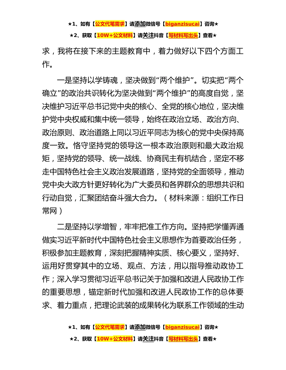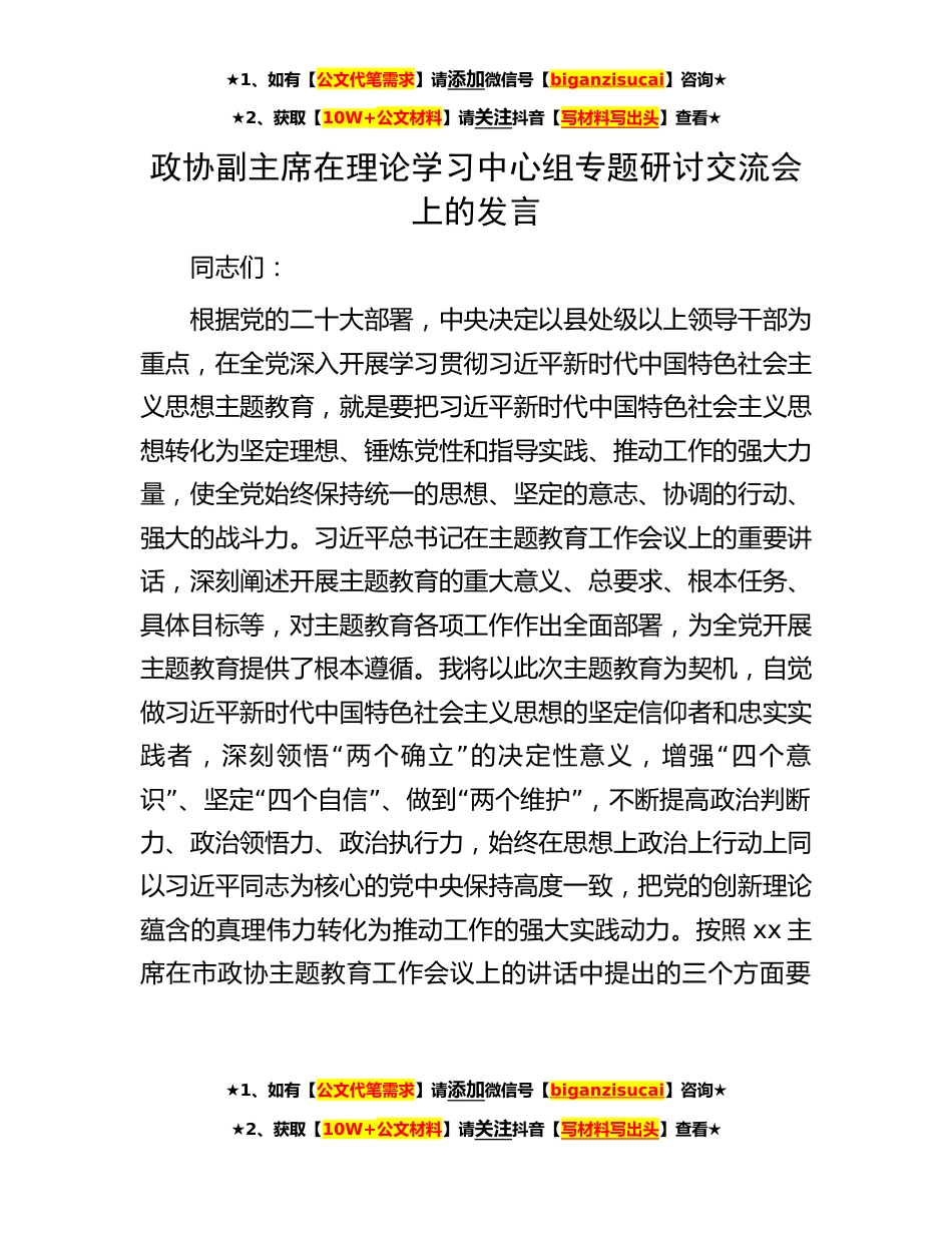 ★1、如有【公文代笔需求】请添加微信号【biganzisucai】咨询★★2、获取【10W+公文材料】请关注抖音【写材料写出头】查看★政协副主席在理论学习中心组专题研讨交流会上的发言同志们:根据党的二十大部署,中央决定以县处级以上领导干部为重点,在全党深入开展学习贯彻习近平新时代中国特色社会主义思想主题教育,就是要把习近平新时代中国特色社会主义思想转化为坚定理想、锤炼党性和指导实践、推动工作的强大力量,使全党始终保持统一的思想、坚定的意志、协调的行动、强大的战斗力。习近平总书记在主题教育工作会议上的重要讲话,深刻阐述开展主题教育的重大意义、总要求、根本任务、具体目标等,对主题教育各项工作作出全面部署,为全党开展主题教育提供了根本遵循。我将以此次主题教育为契机,自觉做习近平...