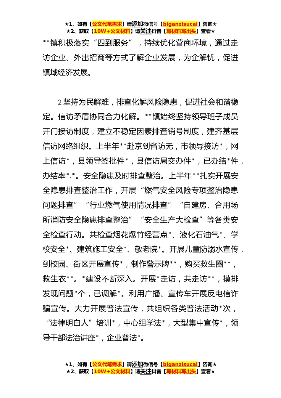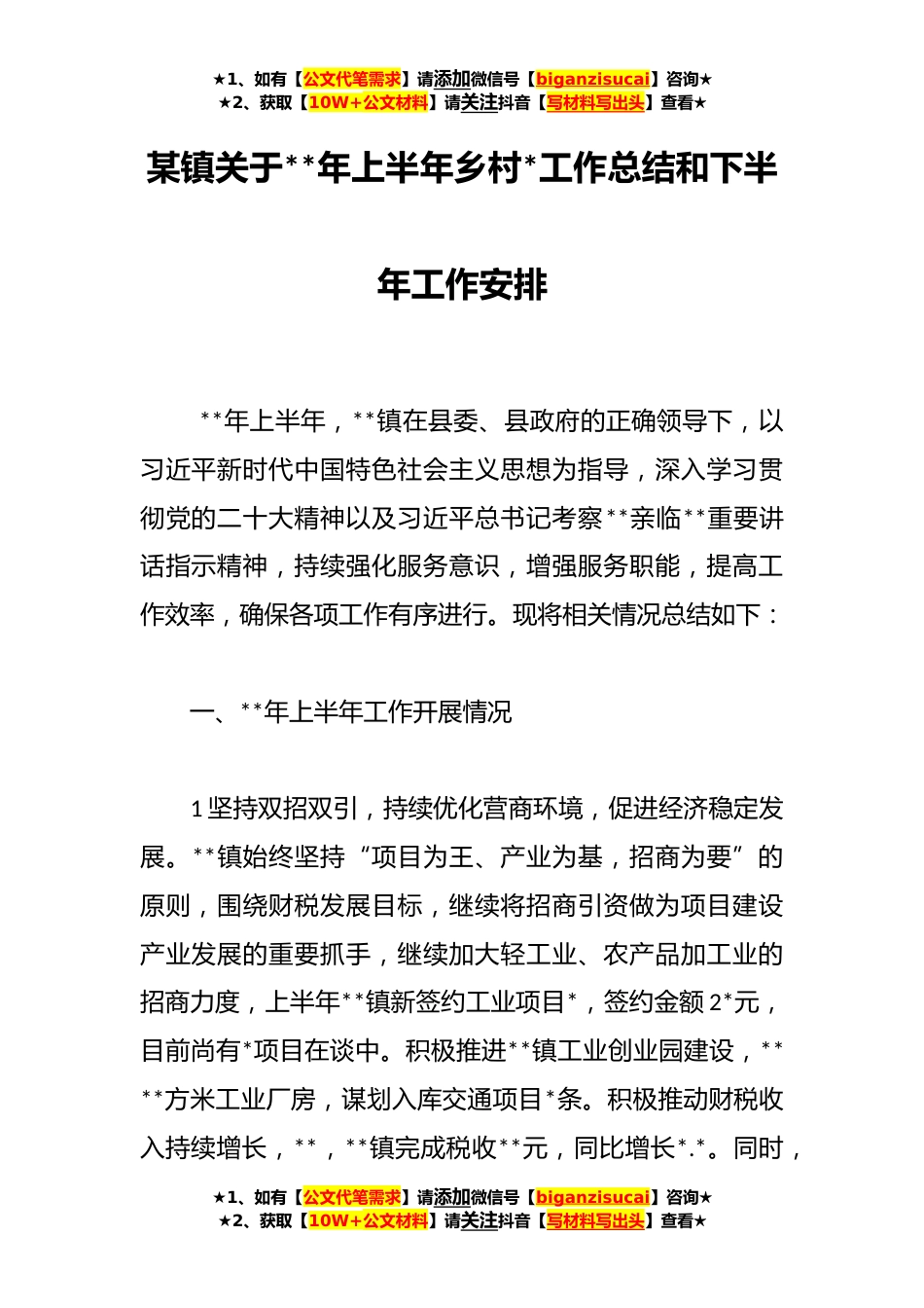 ★1、如有【公文代笔需求】请添加微信号【biganzisucai】咨询★★2、获取【10W+公文材料】请关注抖音【写材料写出头】查看★某镇关于**年上半年乡村*工作总结和下半年工作安排**年上半年,**镇在县委、县政府的正确领导下,以习近平新时代中国特色社会主义思想为指导,深入学习贯彻党的二十大精神以及习近平总书记考察**亲临**重要讲话指示精神,持续强化服务意识,增强服务职能,提高工作效率,确保各项工作有序进行。现将相关情况总结如下:一、**年上半年工作开展情况1坚持双招双引,持续优化营商环境,促进经济稳定发展。**镇始终坚持“项目为王、产业为基,招商为要”的原则,围绕财税发展目标,继续将招商引资做为项目建设产业发展的重要抓手,继续加大轻工业、农产品加工业的招商力度,上半年**镇新签约工...