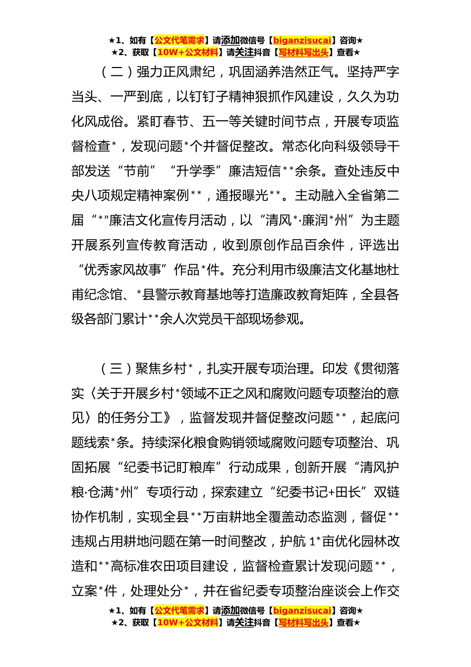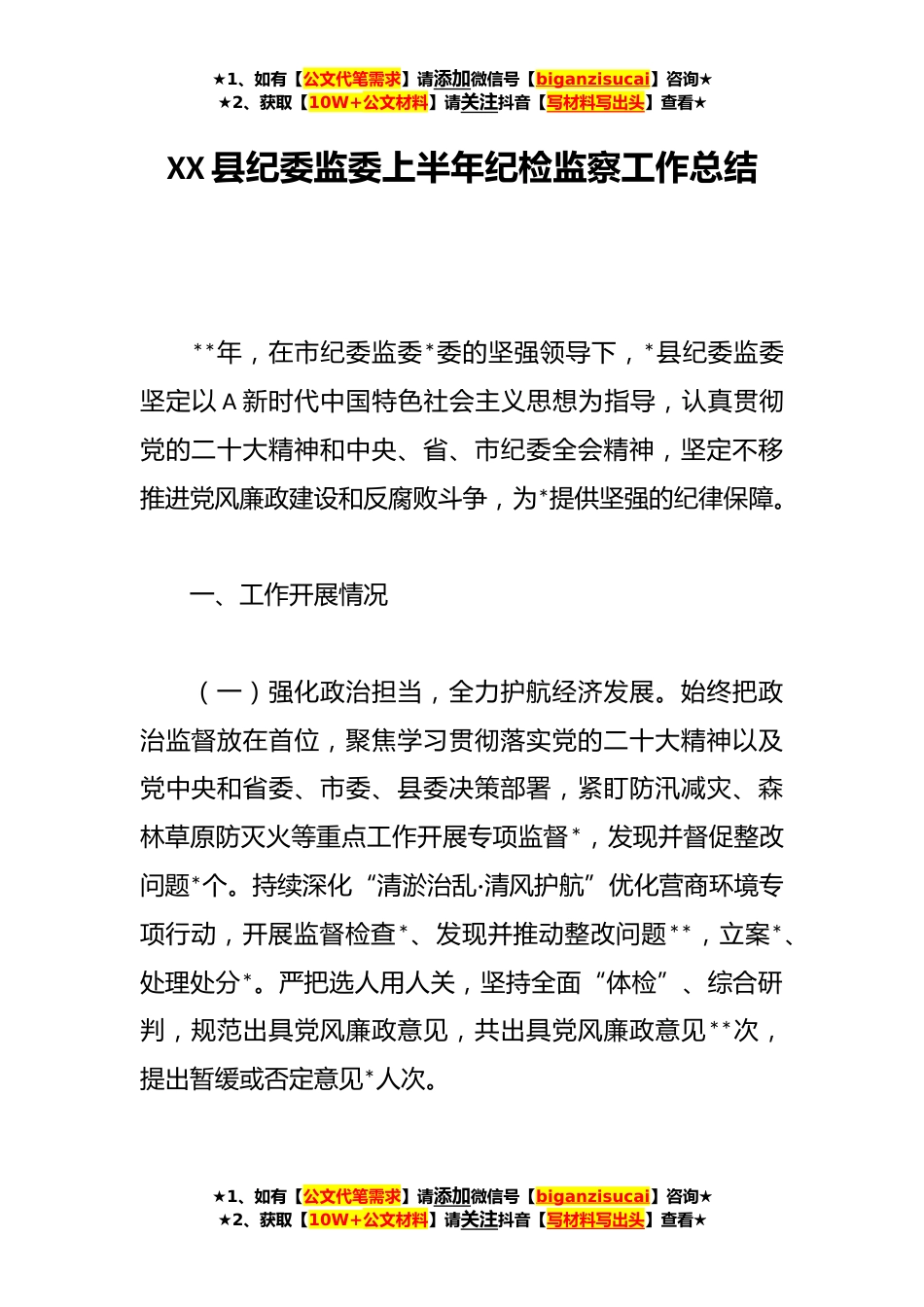 ★1、如有【公文代笔需求】请添加微信号【biganzisucai】咨询★★2、获取【10W+公文材料】请关注抖音【写材料写出头】查看★XX县纪委监委上半年纪检监察工作总结**年,在市纪委监委*委的坚强领导下,*县纪委监委坚定以A新时代中国特色社会主义思想为指导,认真贯彻党的二十大精神和中央、省、市纪委全会精神,坚定不移推进党风廉政建设和反腐败斗争,为*提供坚强的纪律保障。一、工作开展情况(一)强化政治担当,全力护航经济发展。始终把政治监督放在首位,聚焦学习贯彻落实党的二十大精神以及党中央和省委、市委、县委决策部署,紧盯防汛减灾、森林草原防灭火等重点工作开展专项监督*,发现并督促整改问题*个。持续深化“清淤治乱·清风护航”优化营商环境专项行动,开展监督检查*、发现并推动整改问题**,立案...