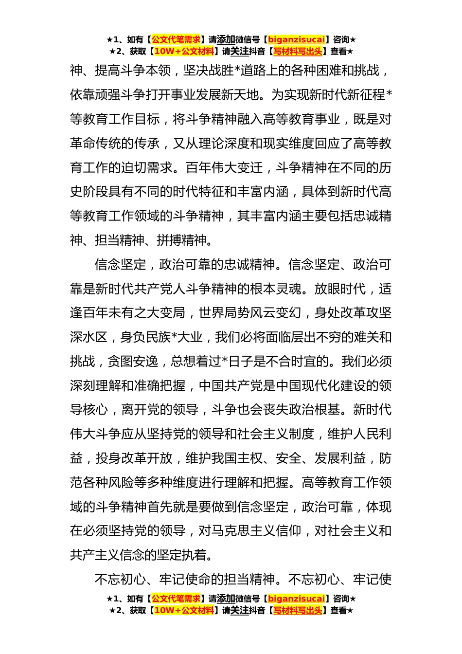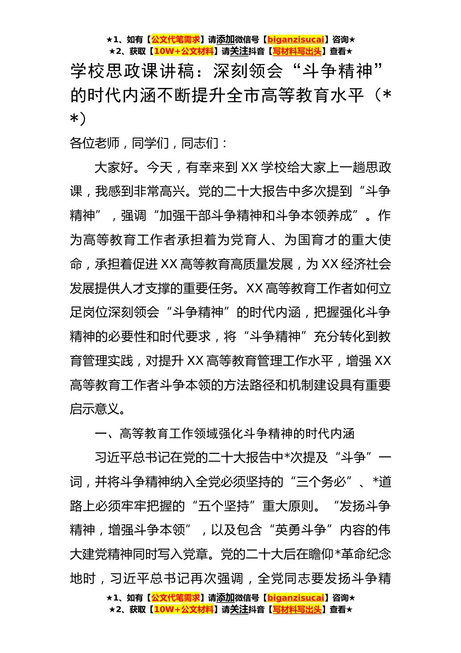 ★1、如有【公文代笔需求】请添加微信号【biganzisucai】咨询★★2、获取【10W+公文材料】请关注抖音【写材料写出头】查看★学校思政课讲稿:深刻领会“斗争精神”的时代内涵不断提升全市高等教育水平(**)各位老师,同学们,同志们:大家好。今天,有幸来到XX学校给大家上一趟思政课,我感到非常高兴。党的二十大报告中多次提到“斗争精神”,强调“加强干部斗争精神和斗争本领养成”。作为高等教育工作者承担着为党育人、为国育才的重大使命,承担着促进XX高等教育高质量发展,为XX经济社会发展提供人才支撑的重要任务。XX高等教育工作者如何立足岗位深刻领会“斗争精神”的时代内涵,把握强化斗争精神的必要性和时代要求,将“斗争精神”充分转化到教育管理实践,对提升XX高等教育管理工作水平,增强XX高等教...
