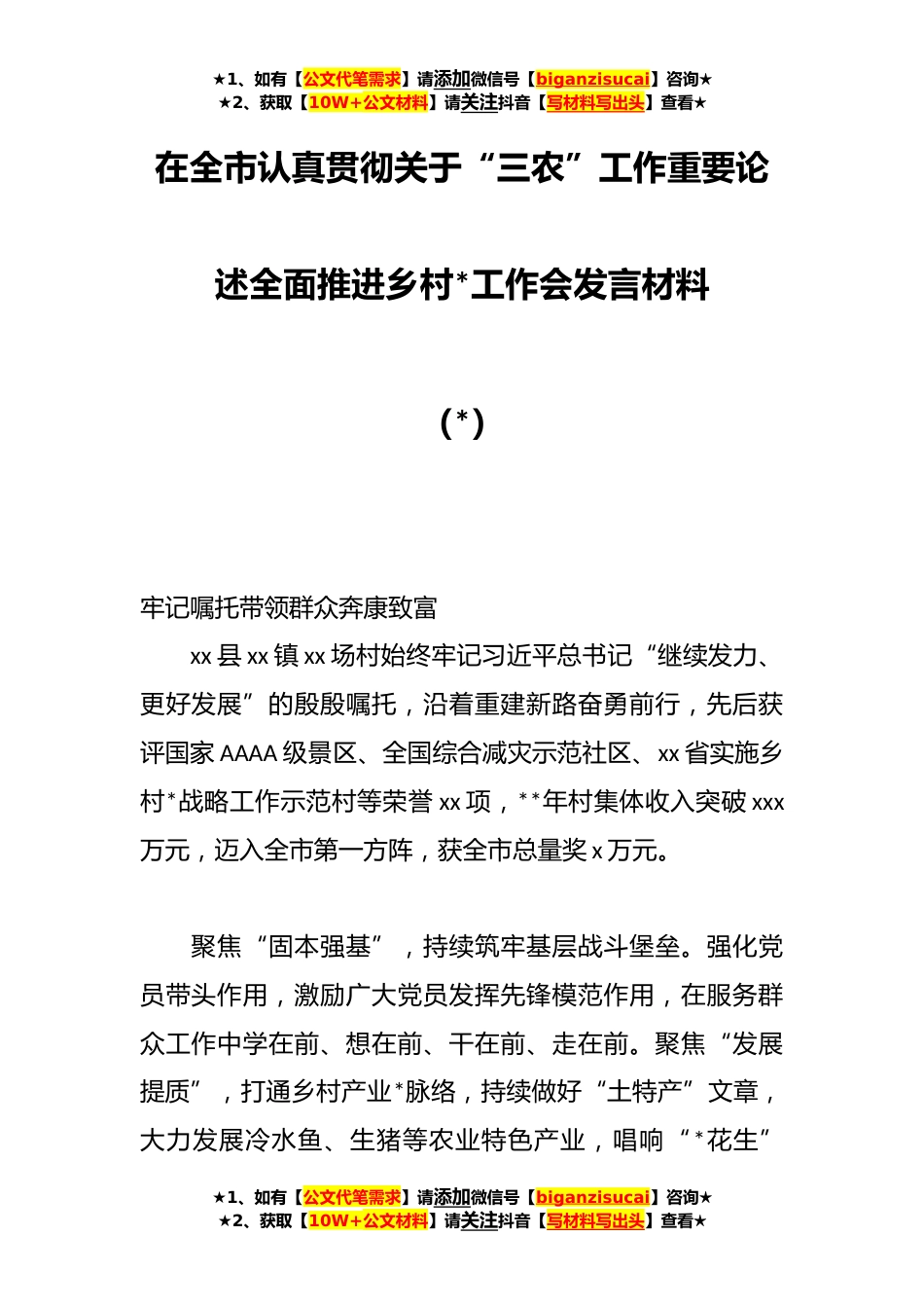 ★1、如有【公文代笔需求】请添加微信号【biganzisucai】咨询★★2、获取【10W+公文材料】请关注抖音【写材料写出头】查看★在全市认真贯彻关于“三农”工作重要论述全面推进乡村*工作会发言材料(*)牢记嘱托带领群众奔康致富xx县xx镇xx场村始终牢记习近平总书记“继续发力、更好发展”的殷殷嘱托,沿着重建新路奋勇前行,先后获评国家AAAA级景区、全国综合减灾示范社区、xx省实施乡村*战略工作示范村等荣誉xx项,**年村集体收入突破xxx万元,迈入全市第一方阵,获全市总量奖x万元。聚焦“固本强基”,持续筑牢基层战斗堡垒。强化党员带头作用,激励广大党员发挥先锋模范作用,在服务群众工作中学在前、想在前、干在前、走在前。聚焦“发展提质”,打通乡村产业*脉络,持续做好“土特产”文章,大力发展冷水鱼、...