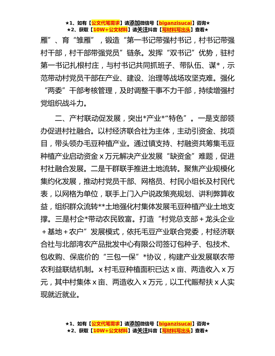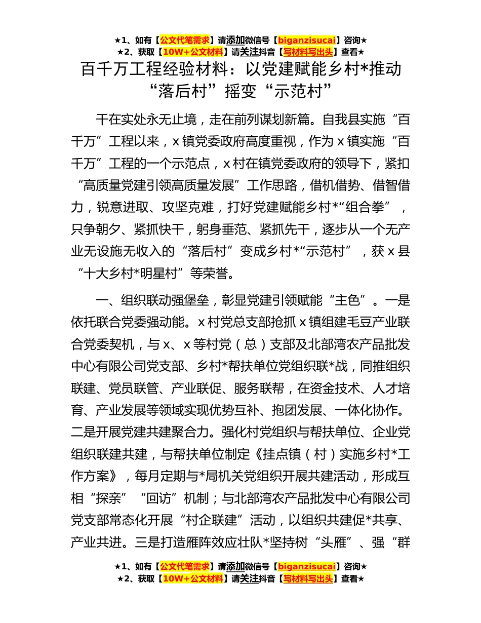 ★1、如有【公文代笔需求】请添加微信号【biganzisucai】咨询★★2、获取【10W+公文材料】请关注抖音【写材料写出头】查看★百千万工程经验材料:以党建赋能乡村*推动“落后村”摇变“示范村”干在实处永无止境,走在前列谋划新篇。自我县实施“百千万”工程以来,x镇党委政府高度重视,作为x镇实施“百千万”工程的一个示范点,x村在镇党委政府的领导下,紧扣“高质量党建引领高质量发展”工作思路,借机借势、借智借力,锐意进取、攻坚克难,打好党建赋能乡村*“组合拳”,只争朝夕、紧抓快干,躬身垂范、紧抓先干,逐步从一个无产业无设施无收入的“落后村”变成乡村*“示范村”,获x县“十大乡村*明星村”等荣誉。一、组织联动强堡垒,彰显党建引领赋能“主色”。一是依托联合党委强动能。x村党总支部抢抓x镇...