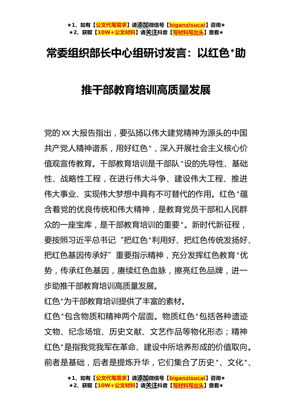 ★1、如有【公文代笔需求】请添加微信号【biganzisucai】咨询★★2、获取【10W+公文材料】请关注抖音【写材料写出头】查看★常委组织部长中心组研讨发言:以红色*助推干部教育培训高质量发展党的XX大报告指出,要弘扬以伟大建党精神为源头的中国共产党人精神谱系,用好红色*,深入开展社会主义核心价值观宣传教育。干部教育培训是干部队*设的先导性、基础性、战略性工程,在进行伟大斗争、建设伟大工程、推进伟大事业、实现伟大梦想中具有不可替代的作用。红色*蕴含着党的优良传统和伟大精神,是教育党员干部和人民群众的一座宝库,是干部教育培训的重要*。新时代新征程,要按照习近平总书记“把红色*利用好、把红色传统发扬好、把红色基因传承好”重要指示精神,充分发挥红色教育*优势,传承红色基因,赓续红色血...