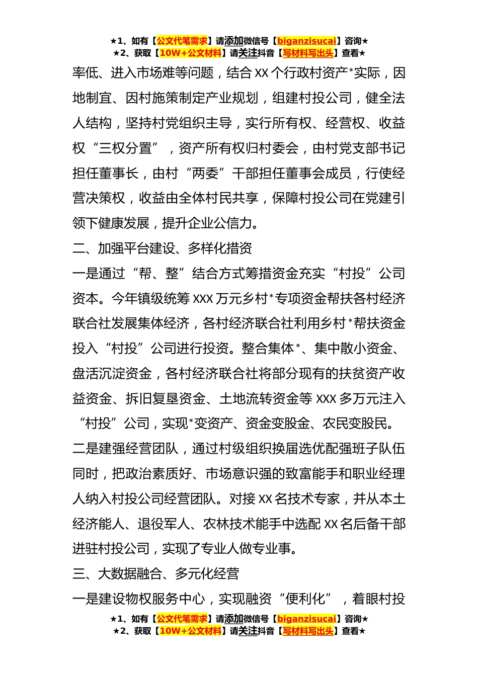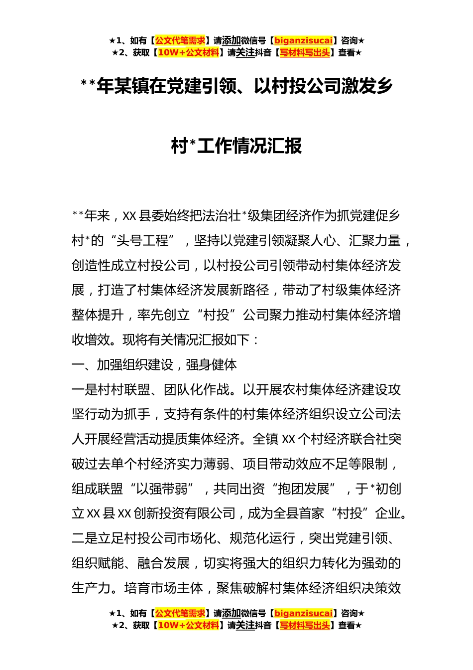 ★1、如有【公文代笔需求】请添加微信号【biganzisucai】咨询★★2、获取【10W+公文材料】请关注抖音【写材料写出头】查看★**年某镇在党建引领、以村投公司激发乡村*工作情况汇报**年来,XX县委始终把法治壮*级集团经济作为抓党建促乡村*的“头号工程”,坚持以党建引领凝聚人心、汇聚力量,创造性成立村投公司,以村投公司引领带动村集体经济发展,打造了村集体经济发展新路径,带动了村级集体经济整体提升,率先创立“村投”公司聚力推动村集体经济增收增效。现将有关情况汇报如下:一、加强组织建设,强身健体一是村村联盟、团队化作战。以开展农村集体经济建设攻坚行动为抓手,支持有条件的村集体经济组织设立公司法人开展经营活动提质集体经济。全镇XX个村经济联合社突破过去单个村经济实力薄弱、项目带动效...
