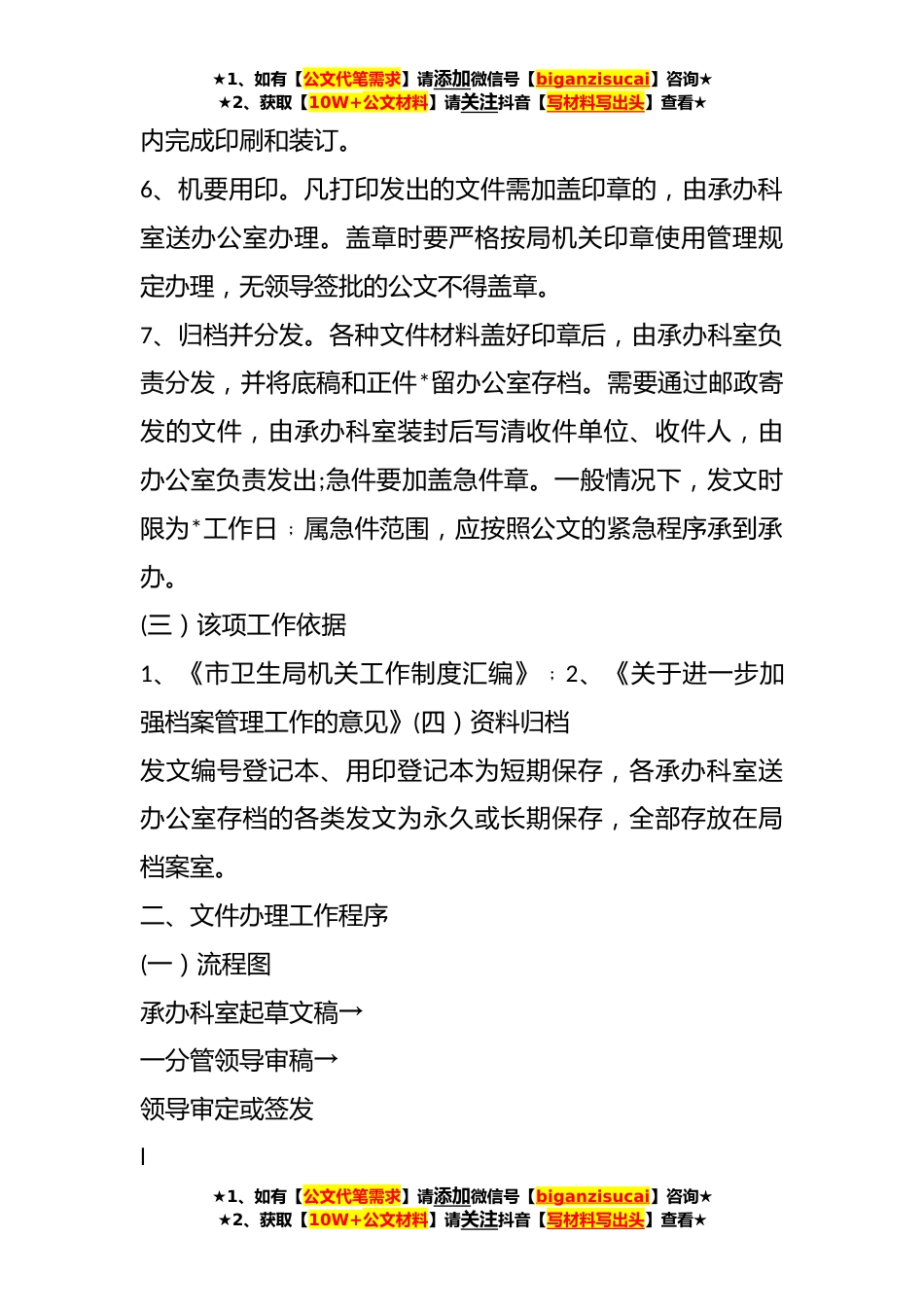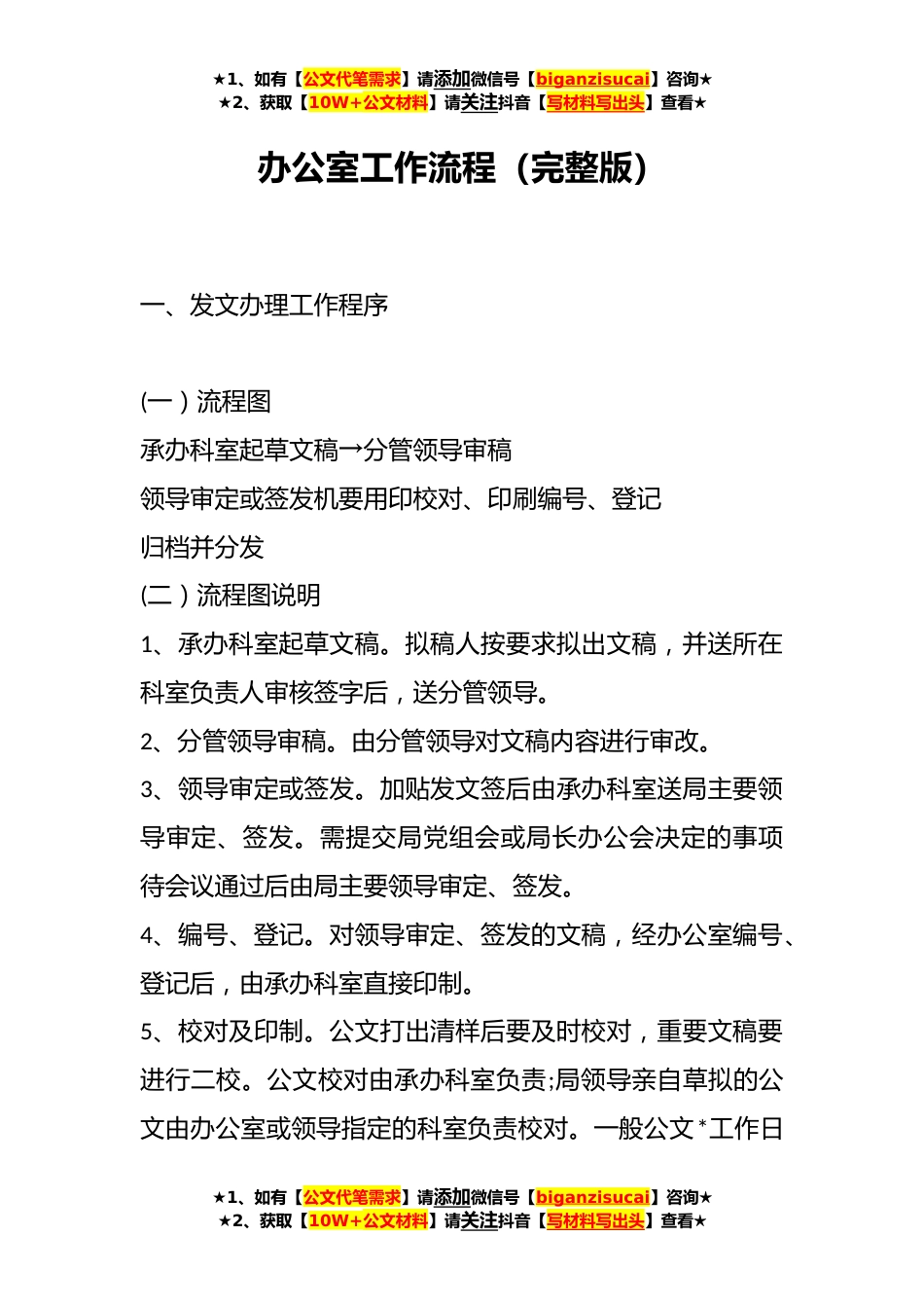 ★1、如有【公文代笔需求】请添加微信号【biganzisucai】咨询★★2、获取【10W+公文材料】请关注抖音【写材料写出头】查看★办公室工作流程(完整版)一、发文办理工作程序(一)流程图承办科室起草文稿→分管领导审稿领导审定或签发机要用印校对、印刷编号、登记归档并分发(二)流程图说明1、承办科室起草文稿。拟稿人按要求拟出文稿,并送所在科室负责人审核签字后,送分管领导。2、分管领导审稿。由分管领导对文稿内容进行审改。3、领导审定或签发。加贴发文签后由承办科室送局主要领导审定、签发。需提交局党组会或局长办公会决定的事项待会议通过后由局主要领导审定、签发。4、编号、登记。对领导审定、签发的文稿,经办公室编号、登记后,由承办科室直接印制。5、校对及印制。公文打出清样后要及时校对,重要...